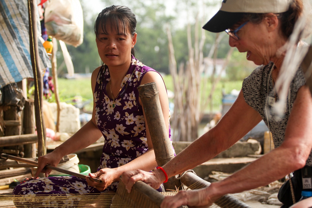 We board the local boats and make the short journey to Binh Tanh island, home to a village of mat weavers. A type of reed grass grows along the muddy banks of the island, from which the stems are collected and processed to provide the raw materials for mat production. The weavers work in pairs – one on the loom, the other feeding in the strands. And while they make it look easy, we quickly learn that the process of quickly feeding the loom is a highly refined art. We also see some baskets made of water hyacinth. While we walk through the village we encounter a full range of fruit trees growing amongst the brick and concrete houses. The concrete roads are narrow with an intermittent stream of motor scooters buzzing through. We also learn that recently frog farming has also proven a lucrative cottage industry and allowed some families to renovate or rebuild their houses.