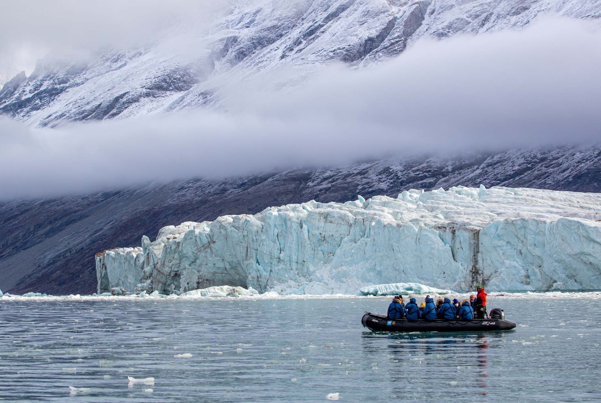 Part of the afternoon was spent with a concentrated effort to find some wildlife, and we passed more muskox and quite a few harbor seals. Alas, the narwhal we hoped to find didn’t appear. Just before teatime, a Zodiac tour was quickly launched to cruise the 2.5-mile-long face of Waltershausen Glacier, one of the widest tidewater glaciers in Greenland. A few large icebergs had recently calved from the glacier, and the late afternoon light provided some fine photographic opportunities.