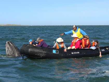 Today we awoke on the National Geographic Sea Bird while floating in the protected and calm waters of Boca de la Soledad, the northernmost entrance to the beautiful coastal lagoon called Magdalena Bay, which is part of an extensive and complex wetland system present in the western side of the peninsula of Baja California. As we all knew, the gray whales come here every winter to give birth and nurse their calves, so we were eager to explore the lagoon and observe these magnificent, gentle, giant marine mammals. Throughout the day we went out in our inflatable crafts, and accompanied our excited guests to help them interpret the complex and fascinating set of behaviors offered by the whales, including spy hopping, breeching, nursing and rolling. Up to 35 pairs of cows and calves were seen in this section of the lagoon. Whales, as we noticed, can be identified individually by the white, black and gray gradations that form unique patterns on their skin, both in calves and their mothers. No whale is identical to another. This has allowed us to give them names, like Sofia, Maria, and so on, for the enjoyment of everyone.