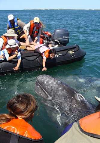 Up to 30 different pairs of mother and calf were seen throughout the day. Most babies were about three to four weeks of age, or older, and were very active, swimming and diving around their mothers’ backs, or nursing, spinning, and fluking. Some of the mothers were not interested in interacting with guests and naturalists, and took their babies away from us. But others stayed with us, and some cows came to play with us, and even allowed to touch them! It just was a matter of streching the arms and hands out! Tears, smiles, foolish words and all types of gestures were seen and heard during this excursion, as the happy consequence of these encounters with the grey, gentle giants.