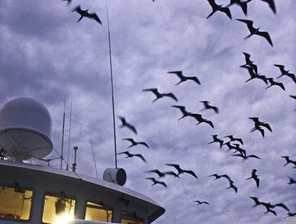 Hundreds of frigatebirds appeared soaring above the National Geographic Sea Bird this morning before sunrise. What a show! They seemed to be stationary, hanging from a low-lying sky, or painted on a cupola, just like a Michelangelo’s Sistine Chapel fresco of black, pterodactyl-like mythological creatures. There was a light breeze and a cloudy sky, too. The bow was covered by dozens of small patches of fish-smelling white substances produced and released by many of those big and magnificent marine birds. The crew kept busy cleaning the sticky guano. We took hundreds of photos, and soon we went down to attend the call for breakfast.