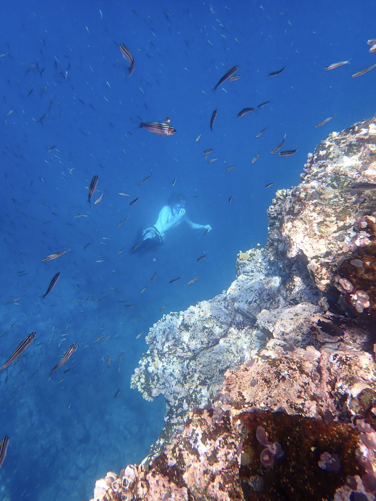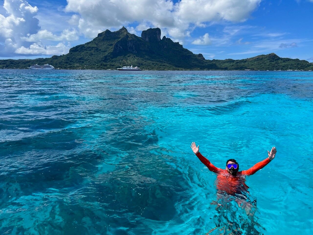 Snorkeling offered the opportunity to spot some excellent marine life in the lagoon area of Bora Bora, including eagle rays, moray eels, octopus, pipefish, and various vibrant reef fish. While diving, we observed blacktip reef sharks, moray eels, reef fish, and stunning corals. The pristine white sand beach made for a great afternoon of relaxing and swimming, and a visit to town offered a great chance to find some Tahitian souvenirs!