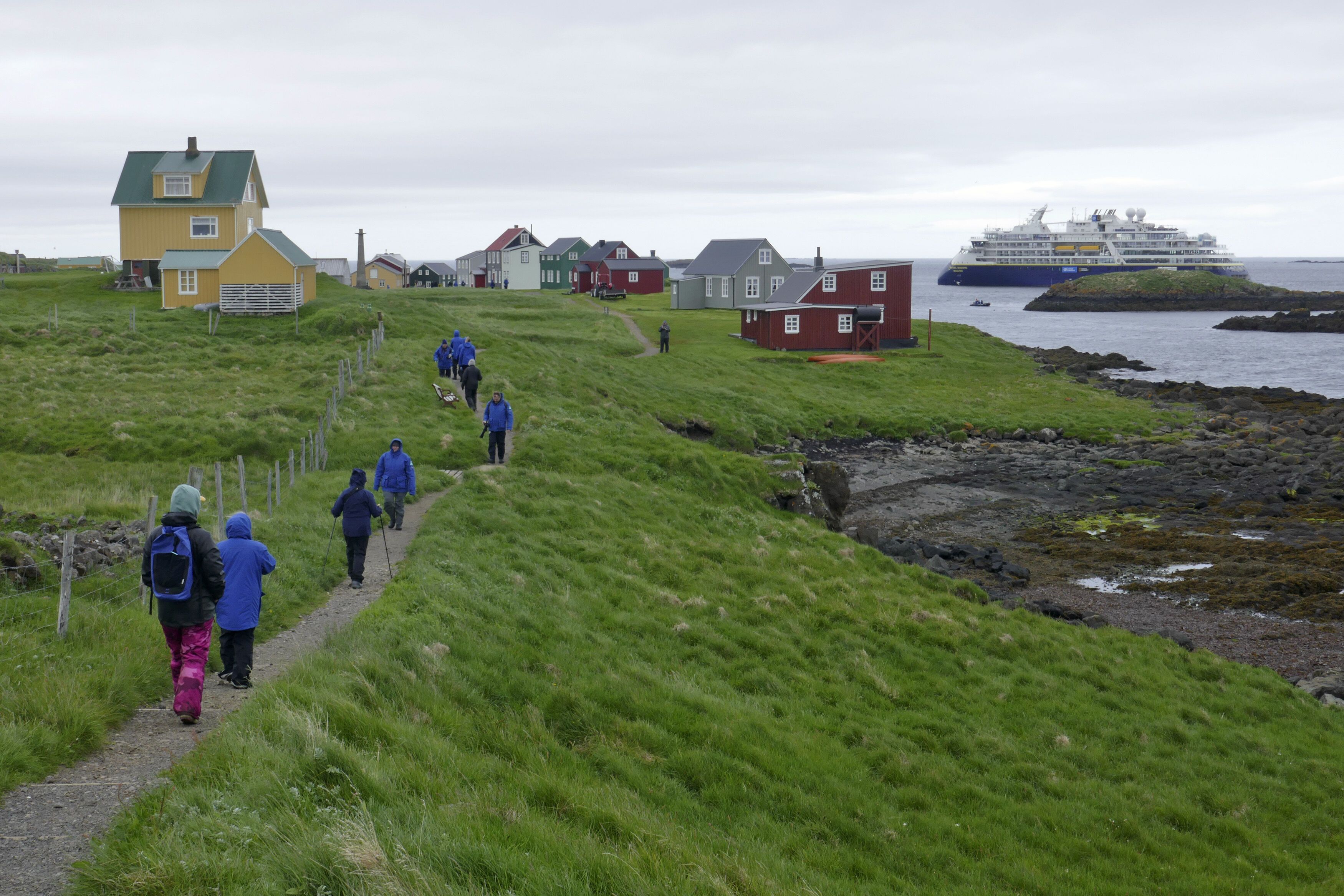 Today, we were introduced to the diverse expedition staff. These individuals will serve as naturalists and guides for the voyage. We sailed into Breiðafjörður, or “broad fjord,” on the west coast of Iceland, spotting wildlife and broad vistas as we approached Flatey, the “flat island” near the head of the fjord. The weather had turned bright, sunny, and calm as we approached our first expedition landing; it was a beautiful summer day to begin our explorations.