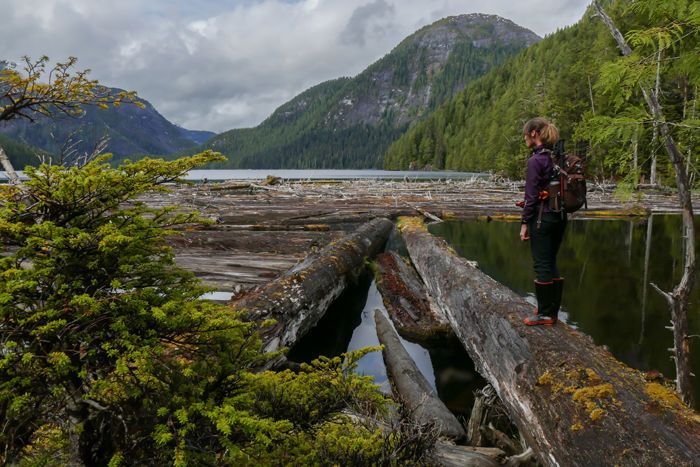 Princess Royal Island was our destination of the morning. Under sunny skies, we took our expedition landing craft to Butedale. This former cannery is under renovation on a grand scale. We walked through the remaining buildings and hiked up to the lake hidden deep in the forest. As we cruised along the shoreline, we were able to get up close to the waterfall that provides the current facility with electricity. In the afternoon we explored the confluence of Campania Sound and Whale Channel, where we found humpback whales and what were possibly fin whales. The definitive white field markings on the fin whales’ lower right jaws were not visible, so perhaps they weren’t fin whales after all—but they were wonderful and appreciated by all on board.