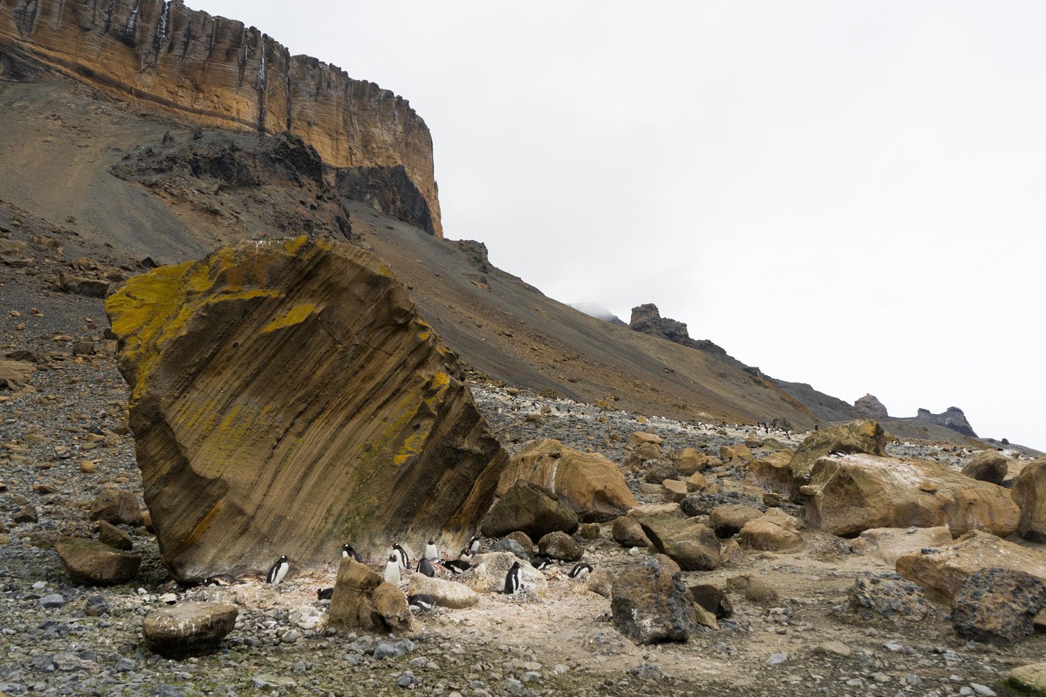 As we made our way south from Elephant Island we noticed a significant increase in the amount of ice surrounding us. Overnight, we made our way into the Antarctic Sound and the north of Erebus and Terror Gulf. It is in this area that the Antarctic currents deposit the icebergs which are broken fragments of the ice shelves of the Weddel Sea. This ice makes travel in this area unpredictable, as large areas can suddenly become blocked up with the changing winds and currents. On considering the conditions we were met with on arrival, we opted to make our first landing of the day at Brown Bluff, on the Antarctic Peninsula. Brown Bluff is a geological spectacle in its own right, formed by various volcanic deposits. These deposits were laid down in such a way as to create dramatic, wave-like shapes in the brown cliffs that rise up from the landing site. It is known for its nesting adelie and gentoo penguins, as well as snow petrels. We watched the penguins, in particular, displaying typically eccentric and comic behaviour in stone theft, fighting and generally providing vast amounts of character to the local ecosystem.