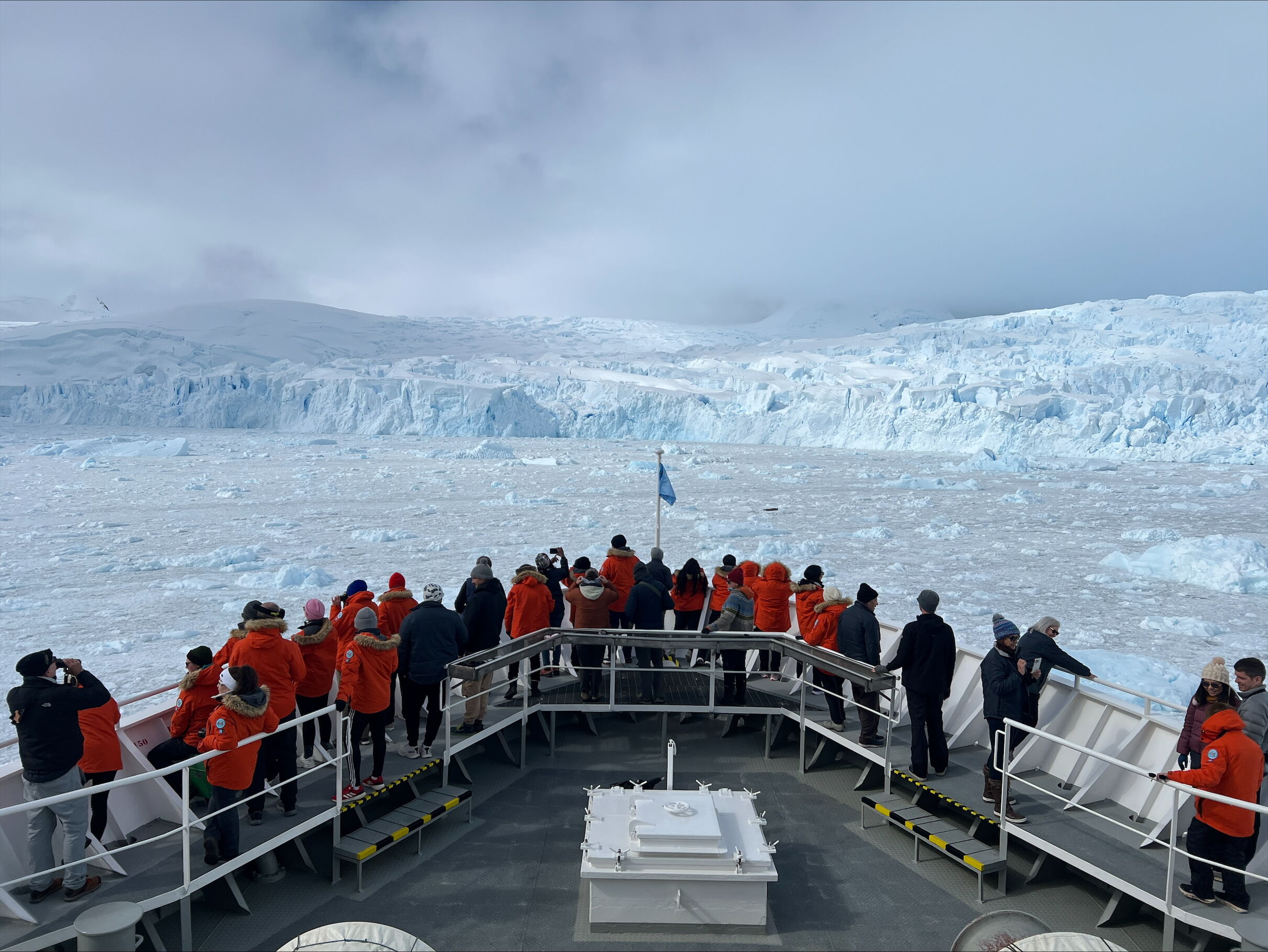 Barely had we departed the bergs than a pod of orcas passed by, and we watched them as they skirted the edge of A80A, searching for food. Finally, as we arrived at the ice sheet off Snow Hill Island, we glimpsed emperor penguins, raising our hopes for tomorrow’s exploration.