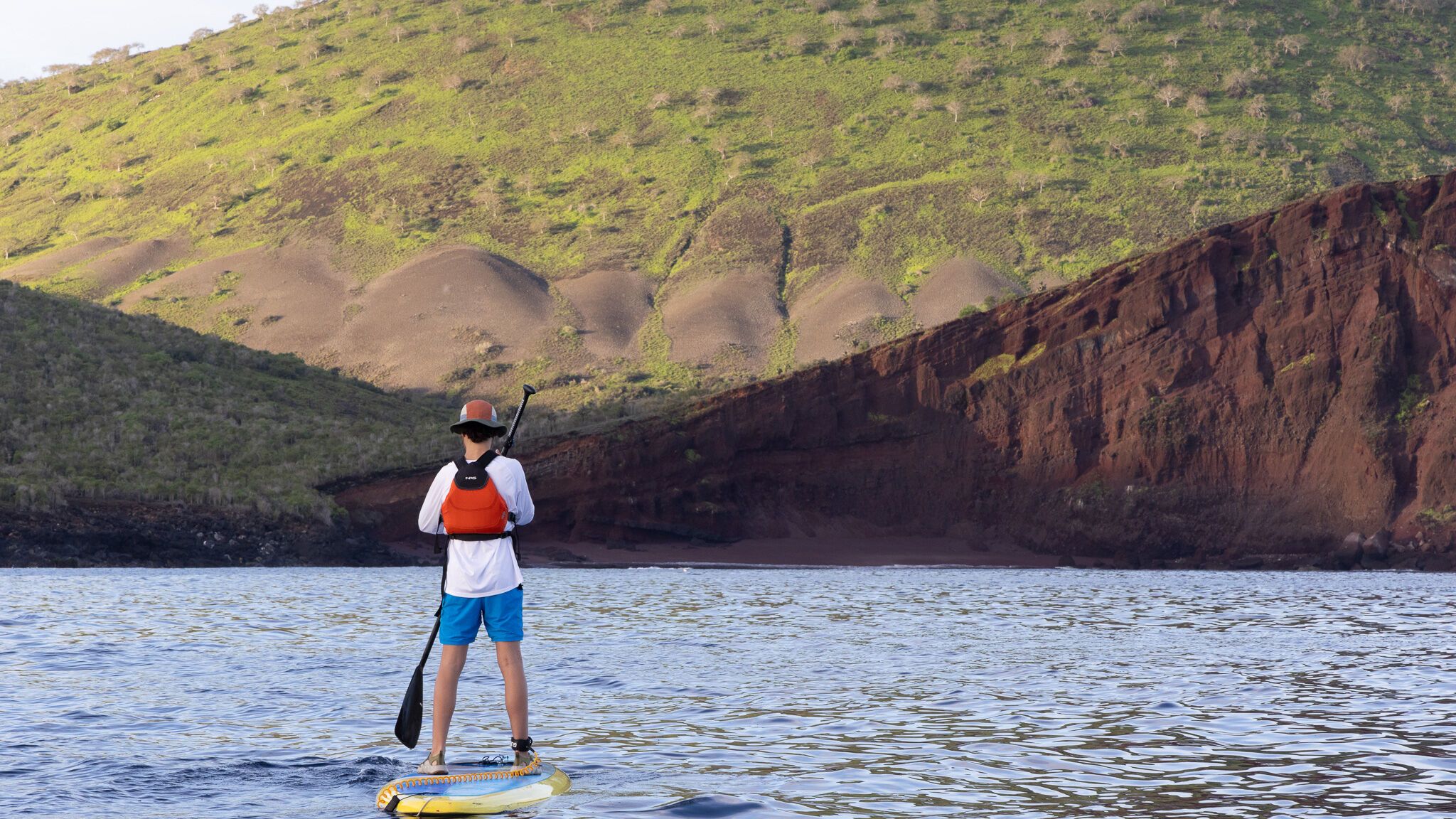 This morning, we embarked on a scenic hike at Punta Pitt, San Cristóbal Island, where we found all three booby species - red-footed, blue-footed, and Nazca. We also took a Zodiac ride along the rugged coastline for close-up views of dramatic cliffs, surrounded by seabirds and sea lions basking in the sun. In the afternoon, we kayaked around Cerro Brujo’s golden cliffs, followed by a relaxing stroll along its pristine white-sand beach. Some even enjoyed a refreshing swim in the turquoise waters. This perfect day ended with a cruise around Kicker Rock, lit in the golden light of sunset.