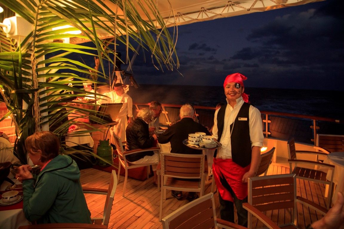 As we sail, we take time to immerse ourselves into informative lectures about the incredible knowledge these civilizations held over stars, ocean currents, and weather patterns. We also learn about the geomorphology of the Pacific Ocean and islands, animal migration, the origin of pearls as well as music. The night ended with a delicious pirate-themed barbeque and an after-dinner viewing of Bounty to give those watching a sample of the history of buccaneering in these wide, exciting waters.
