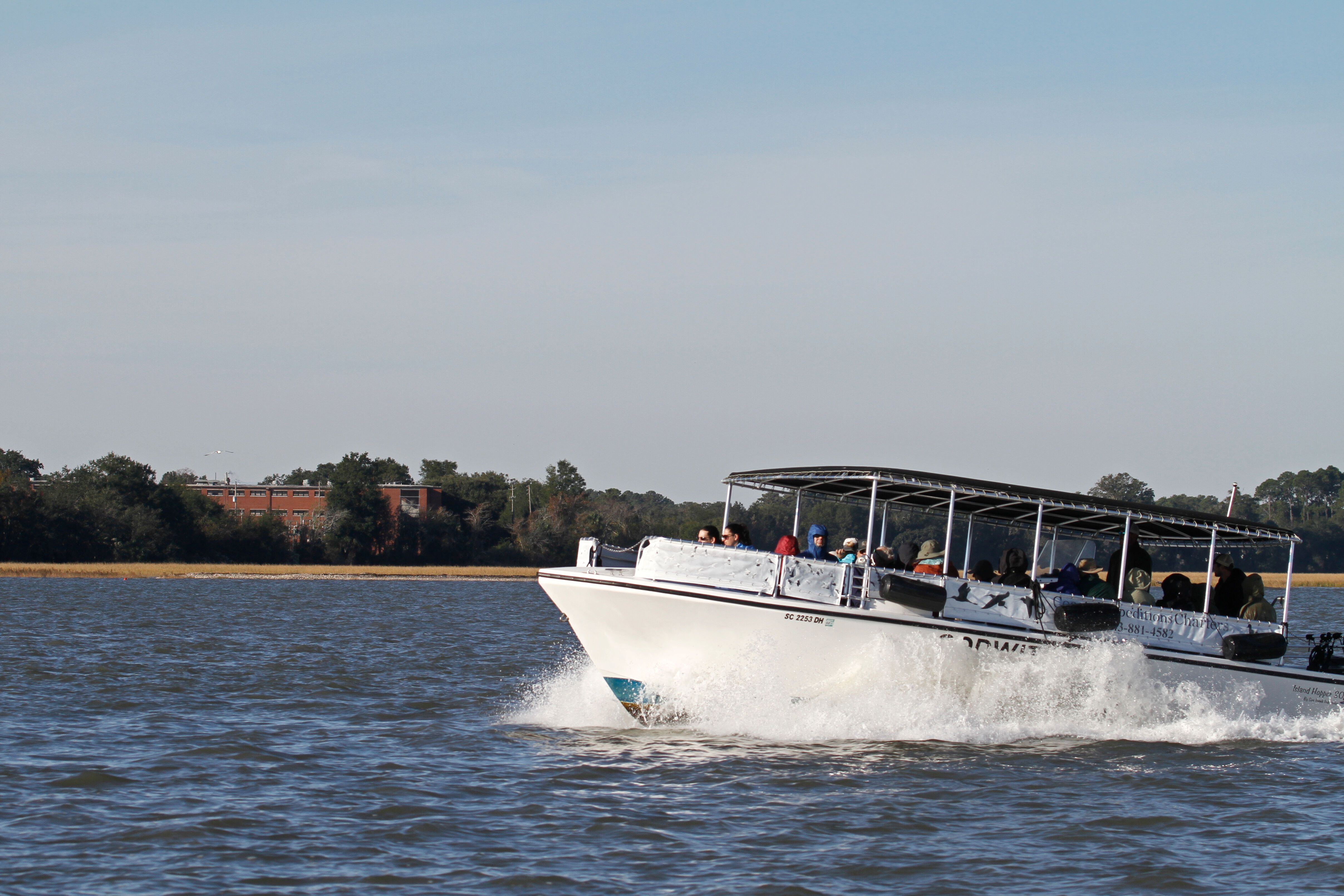 The morning came with grace. In the pre-dawn light, a gentle breeze cleared the air while the sun’s rays painted the saltmarsh with reds and purples. With a week of cloudy skies behind us, this beauty was welcome. After a delicious morning breakfast, we set out on the M/V Godwit and Gannet to Saint Phillip’s Island State Park. Weaving through the channels of the saltmarsh in the morning light was a delightful tour of the sea-islands ecosystem. Estuarine bottlenose dolphins played in our wake as we passed by, moms and calves rising in tandem as they fished and played. Wading birds erupted from the coastal marshes, driven to the small grass mats by the exceptionally high tides. We were the only people on Saint Phillip’s Island. This pristine sea island has never been developed aside from one house and some structures for visitors to enjoy it by. Via tram and foot, we set to explore what it had to offer. Spanish moss swung from the live oaks, holly berries giving color to the already saturated flora. At the end of the path lay a beach where the Atlantic Ocean greeted us. Abundant driftwood gave us countless photo opportunities with its endless patterns and forms. After another exciting boat ride through the coastal marsh, we visited the Penn Center. This US National Historic Landmark was the first school for formerly enslaved persons after the outbreak of the Civil War. Our guides taught us about this rich history and let us look at their detailed and enthralling exhibits. Coastal South Carolina has shown us so many of its incredible corners. We’re so grateful to experience such wonderful parts of a beautiful place. While we’re sad to see this voyage end, we carry these memories with us and will share them with the excitement they deserve.