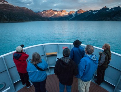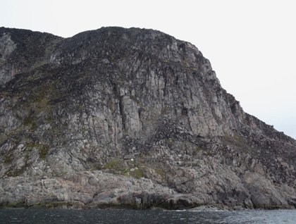 Early this morning, we entered Butterfly Bay, which is located on a narrow peninsula in the southeast region of Baffin Island. This is a very rocky area and one can see the ancient exposed bedrock here that is part of the Canadian Shield. Understanding the basics of metamorphism and the concept of geological time make this a very exciting place to explore. We divided ourselves into various groups for different organized hikes out over the lower regions of a broad, glacially-carved valley. Upon landing, we discovered an interesting raised high-energy shingle beach composed of rounded rocks (mostly granites, schists, and gneisses) that protects a lower, boggy, moss-covered area that was strewn with logs and other debris that had floated all the way across the Arctic Basin from Russian rivers only to make landfall here on Baffin Island.