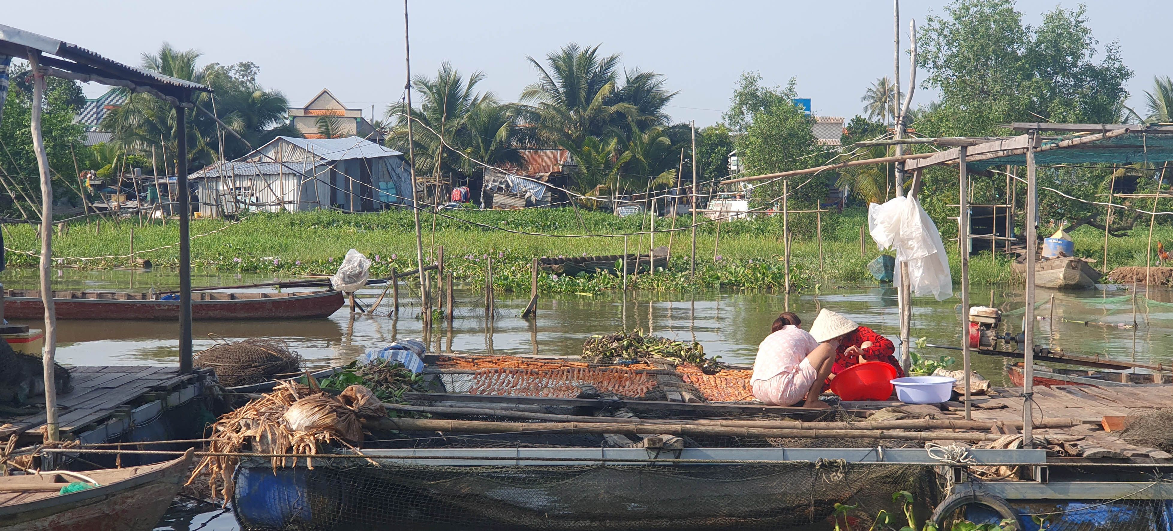 After our morning excursion, local guide Tri gave a presentation about the Mekong Delta. After lunch, our photo instructor gave a presentation about iPhone photography. Then, we hopped on sampans again for a cruise to a small village on Binh Thanh Island to walk through local homes and learn about the processes of weaving, drying, and exporting functional mats. At the local community center (which is also a colorful temple), we met with village elders for a short discussion. One of the highlights of the village visit was a little girl with a tiny dog wearing a red-checked dress. After dinner, National Geographic expert Barry Till gave a presentation entitled, “Water Problems in Southeast Asia: the Mekong River and South China Sea.”