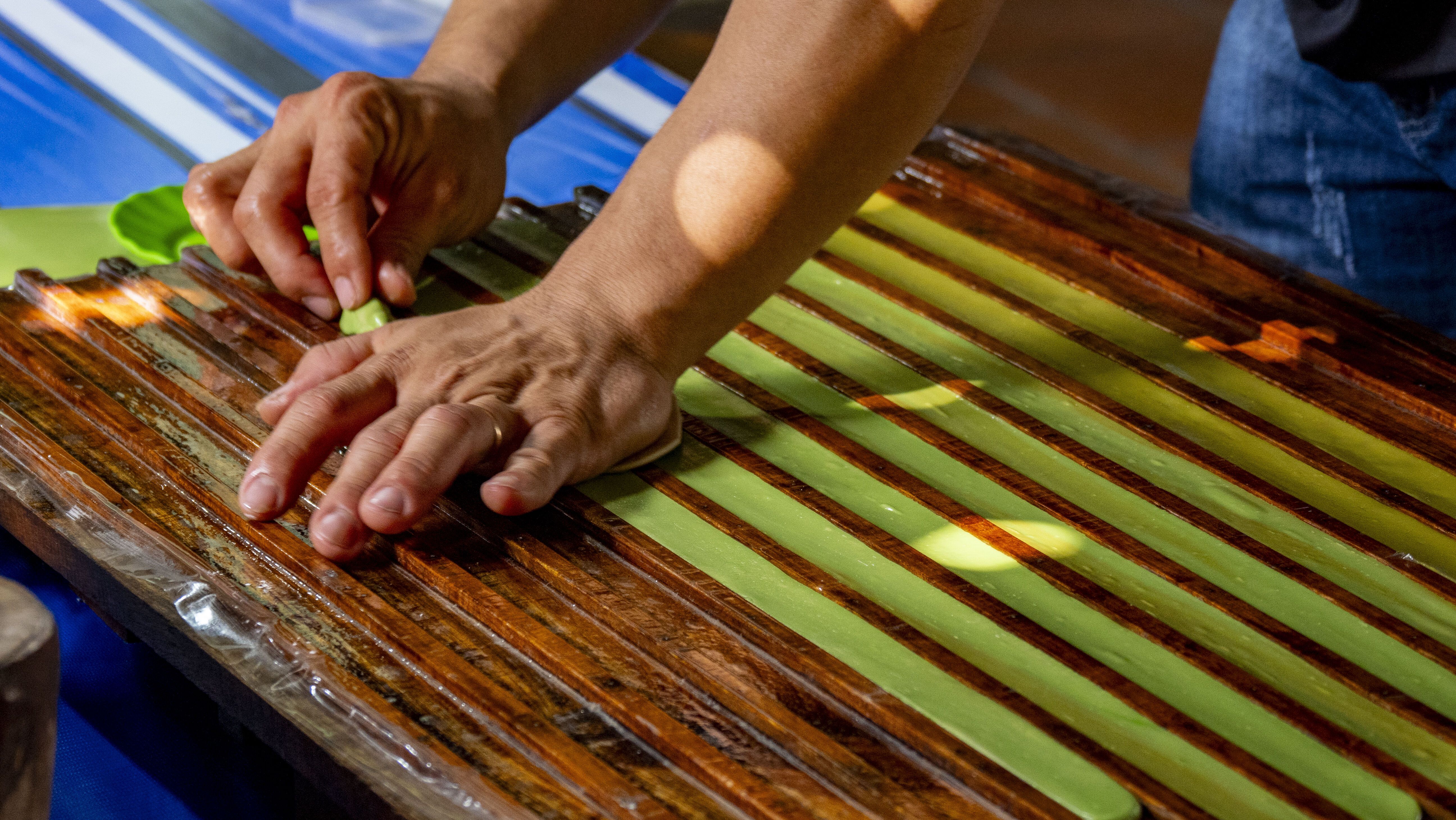 Vietnam is a place for sensory overload. There are so many rich and colorful sights happening all around you at any given time, it’s hard to focus on one thing. Today was no exception, and as we made our way on the river to the town of Chi Be, we passed ferries, cargo ships, and bright fishing boats. My camera was buzzing as it captured one image after another. But it was in a little candy shop that my attention was drawn to the remarkable ability of the Vietnamese to create these mouthwatering coconut candies by hand. The process is tedious, precise, and at the end of it all, delicious. Every aspect of the candy was made by hand, even the rice paper in which the candy would be wrapped.