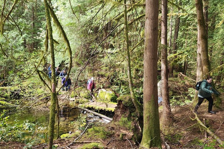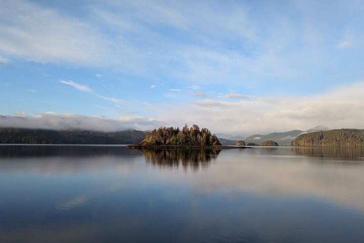 This morning, National Geographic Sea Bird awoke to dark grey skies in Queen Charlotte Sound on the south end of Hecate Strait. Stretch class was interrupted by a squall, and the devotees decided that hot drinks in the lounge were a better option. After breakfast, we had a few informative presentations en route to our next landing along the coast of B.C.