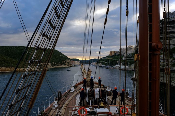 The sun rose was at 7:15AM and the sea was virtually flat. We had a mild breeze but were hoping it would improve so we could sail. And sure enough, by 8AM Captain Komakin called the sailors to their stations and we were shortly at sail. The wind improved and we were sailing by the fabled coast of Cartagena by 9AM. Our National Geographic photographer, Massimo Bassano, gave a lively talk on how stories are constructed in the National Geographic magazine.