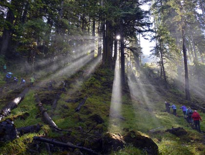 The early morning sunlight had just crested the hill to the east of the waterfall, filling the area around the base of the waterfall with sunlight reflected off millions of particles of mist. The tall spruce and hemlock created long shadows slicing through a wonderland of backlit shrubs, trees, and tall grasses. All were decorated in droplets of mist, sparkling in the morning sun like the tiniest gems shifting in the soft wind created by the roaring waterfall in the background and still in early morning shadow.
