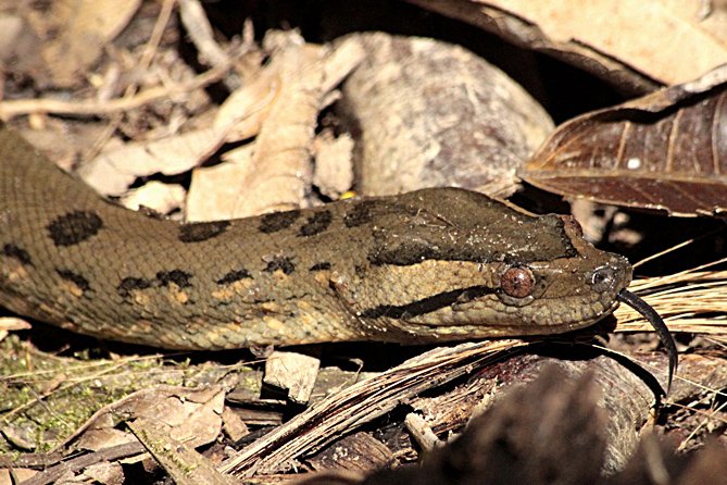 The traditional knowledge of our naturalists together with the keen eyes of the native scouts made a great combination. We saw a Tarantula and several insect species as well. We observed several frog species as well. The icing of the cake of this morning´s outing was the unusual spotting of a couple of beautiful snake species a juvenile anaconda and a red-tailed boa.