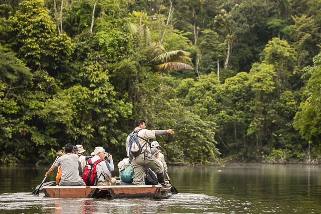 In the afternoon, after a great lunch and a photography presentation, we explored Yanayacu River, one of the tributaries of the Marañón River by skiffs. The early and late hours of the day are the best ones for spotting creatures of the rainforest. The wildlife found around this location is incomparable, we spotted kingfishers, herons, hawks, parakeets, parrots, a couple of sloths, and several pink dolphins during our exploration. We came back to ship at sunset with a fiery red sky as our companion. The latter scenery was spectacular!