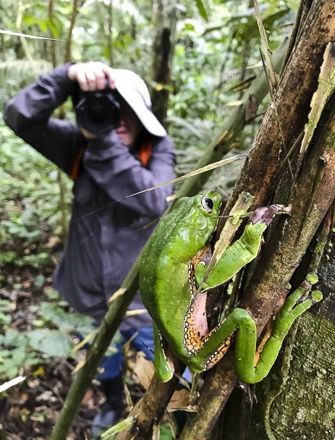 After breakfast, we tried our boots on and went ashore at Casual to hike a trail that the local people have been maintaining and protecting. Located on the northern shore of the Marañón River, opposite to the Pacaya-Samiria Nature Reserve, Casual is a wonderful place of slightly elevated land that never gets flooded during the high water season. It was a great introduction to the tropical rainforest and a few men from the village nearby helped us finding some creatures. That way we had the amazing opportunity to meet some truly fantastic animals up-close and personal. We saw several poison-arrow frogs, a much larger arboreal monkey frog which was a most spectacular subject (made us photographers drool with excitement!), and a 9 ft long green anaconda and a smaller red-tailed boa reminded us of tall tales from early explorers about huge snakes. Of course, no early explorer's account from centuries past was complete without a tarantula and we were no exception; many of us had the pleasure to admire and photograph an impressive-looking and attractive red-knee tarantula that even took a stroll on a few guests' arms.