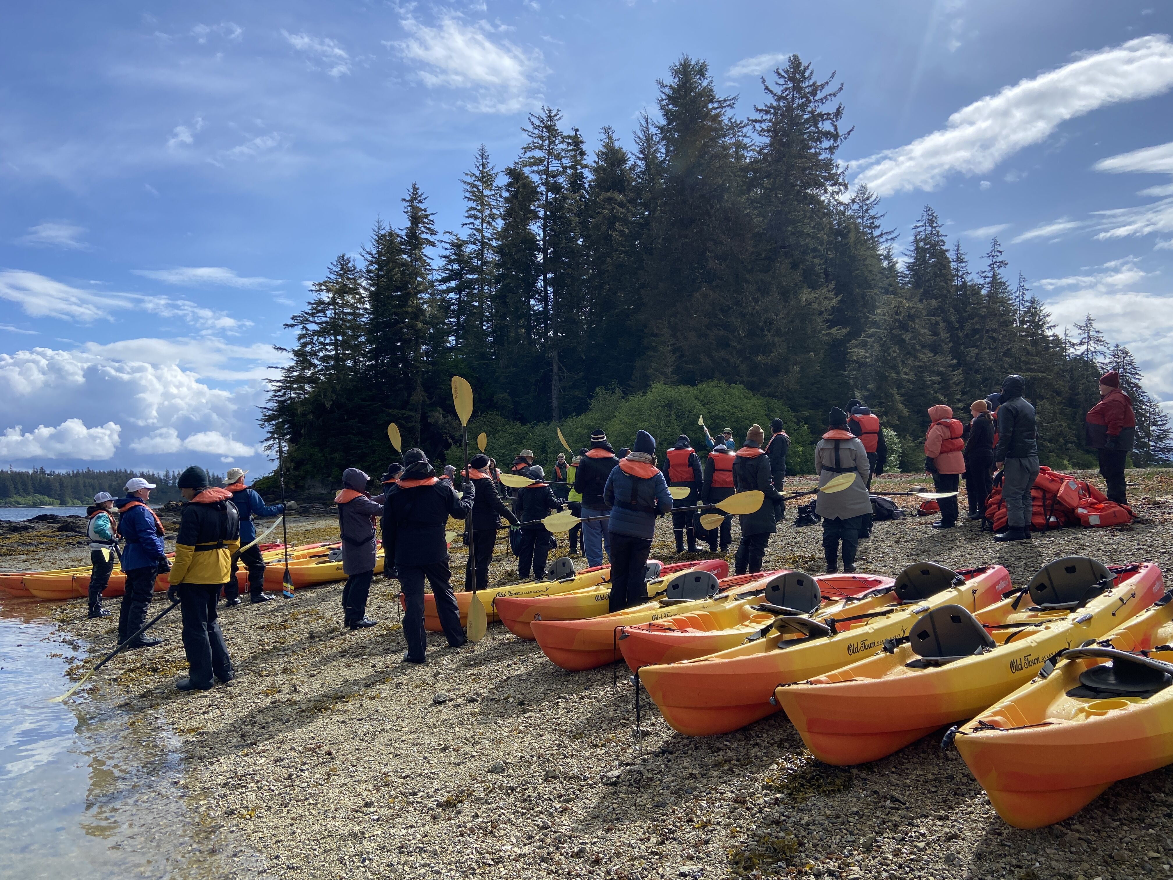 Early morning promised to provide some relief from the wet weather experienced over the past two days. Sunlight streamed through scattered clouds as National Geographic Quest sailed south from Petersburg toward the Keku Islands, west of the small town of Kake, Alaska. Promise delivered: we had sunshine and just about everything else Mother Nature could throw at us as we kayaked and toured by Zodiac within the calm waters of the Kake island chain. By midmorning, the clouds were back. A short but intense rain and hailstorm pummeled both guests and guides as we paddled and Zodiac cruised along the coastline. No matter, as this is all in a day’s work for anyone exploring the wild coast of this temperate rainforest. And as they say: “If you don’t like the weather, just wait ten minutes, and it’ll change!” It did, and the wind dropped enough for our young Global Explorers to learn the skills required to drive the Zodiacs. Adventures completed, we returned to the ship for lunch and some downtime before afternoon cruising.