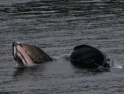 Humpback whales have made a remarkable comeback in Southeast Alaska since the end of the whaling days. These whales, after wintering in Hawaii, spend all summer here feasting. We encountered a group of four to six whales surface feeding very close to shore. Repeatedly, these whales would lunge, mouths agape, random body parts flailing in the air. Sometimes, they even showed the beautiful pink roof of their mouths. It was incredible to be looking right down the throat as they were feeding. And what were they feeding on? Well, closer analysis of the photos revealed many small pink things trying to escape the gaping mouths. KRILL!!!!! Over and over, these whales were feasting on krill, and we collectively took thousands and thousands of photos. What a morning!