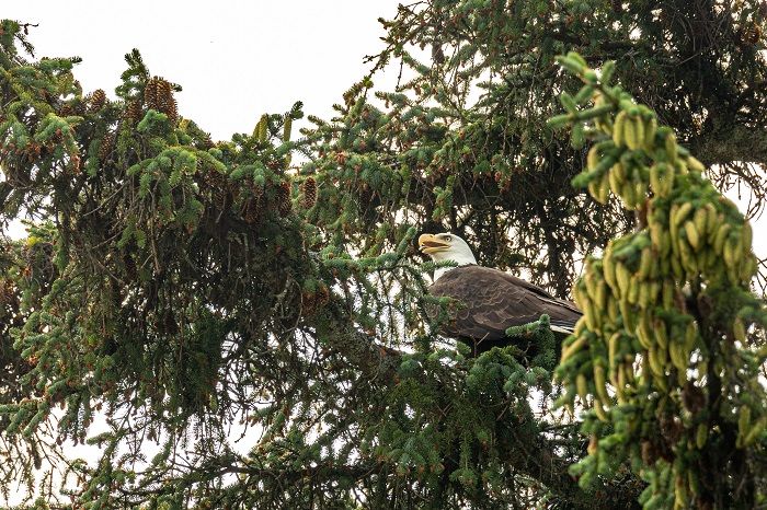 In the afternoon, National Geographic Quest anchored in Hanus Bay on the northwest end of Baranof Island. Guests shuttled to shore by Zodiac for operations exploring the area in and out of the water. Some guests went kayaking into a tidally influenced lagoon at the mouth of a salmon stream, angling to see what fishes and invertebrates live in the seagrasses, and whether a bald eagle would dive down to grab anything to eat. Hikers walked along a beautiful trail maintained by the Forest Service to a lookout that had a view of the sockeye and coho salmon making their way upstream to spawn later in the summer. Some adventurous guests made it all the way to Lake Eva, looking and listening for bald eagles, belted kingfishers, varied thrushes, and red-breasted sapsuckers. All in all, a very full day leaving everyone excited for what is to come for the rest of the week.