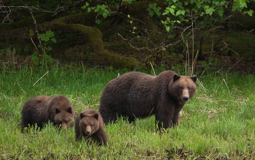 During the second round, I joined the kayakers and was rewarded with even more views of the brown bear sow and her cubs on the beach! All-in-all, it was a superlative first day in Southeast Alaska – humpback whales, eagles, harbor seals and a close-up (but safe) encounter with a large, healthy brown bear with her good-sized triplet cubs.