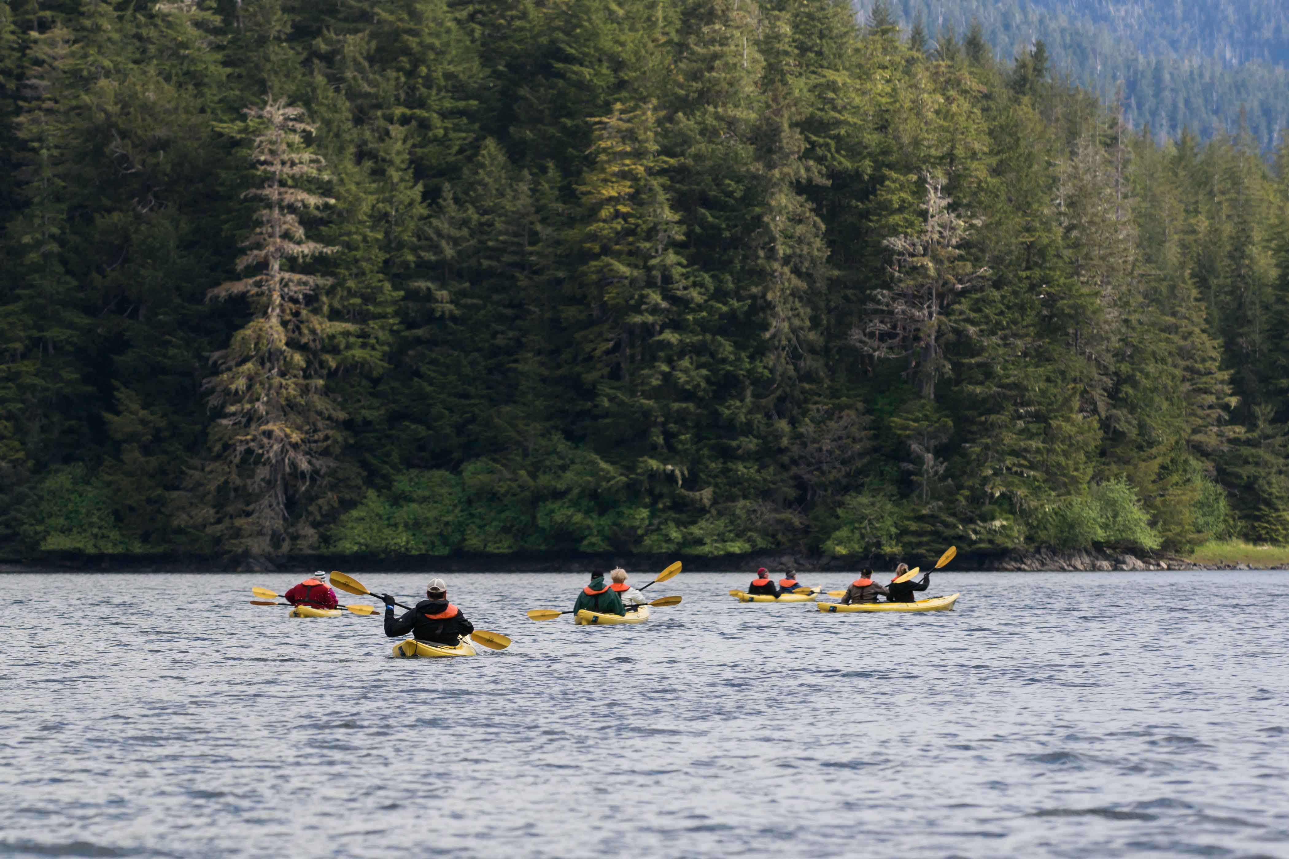 This morning, we awoke to dramatic, layered clouds draped on the forested mountains of Peril Strait. As we approached the Chatham Strait, the sun started to peek through – casting rays and spots of brilliant light on the waters around us. We had two different humpback whale sightings during the morning, which perfectly coincided with the breaks before and after the briefings by our naturalists and Third Mate which focused on expedition landing craft and kayak operations, bear safety and hiking. The humpbacks that joined us just before lunch slowly got closer and closer to the ship to where we were able to clearly view the blowholes just off the bow.