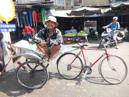 Our exploration of swimming capital gave way to roadside commerce as we were matched one passenger per bicycle coach for a tour of Chau Doc. Sunburned Westerners snaking through the city brought many a curious look from locals who wondered openly if the pinkskins were too poor to afford a minibus. Cruising at the bottom of the food chain made the texture of the city all the more palpable against the groans and grunts of our peddling drivers.