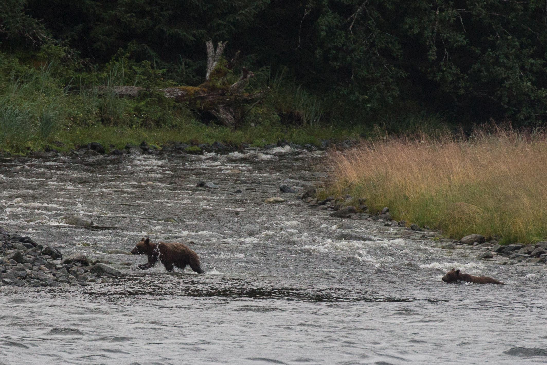 El dia de los osos! Not one or two, but a total of six brown bears were seen today on the shore of Chicagoff Island we began our exploration of Southeast Alaska. The first two bears were a young pair recently released from their mother’s care. Rather small, thin and apparently very hungry, they explored the upper intertidal for food. Later, but still before our lunchbreak, two large brown bears were seen also in pursuit of food along the intertidal near a small salmon stream.