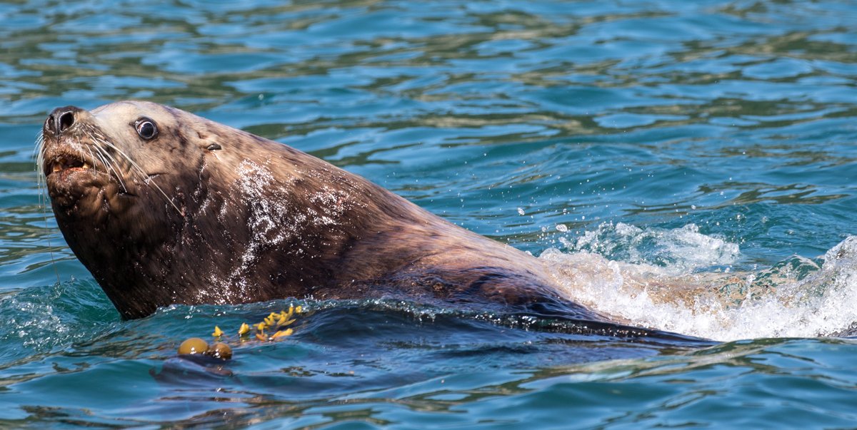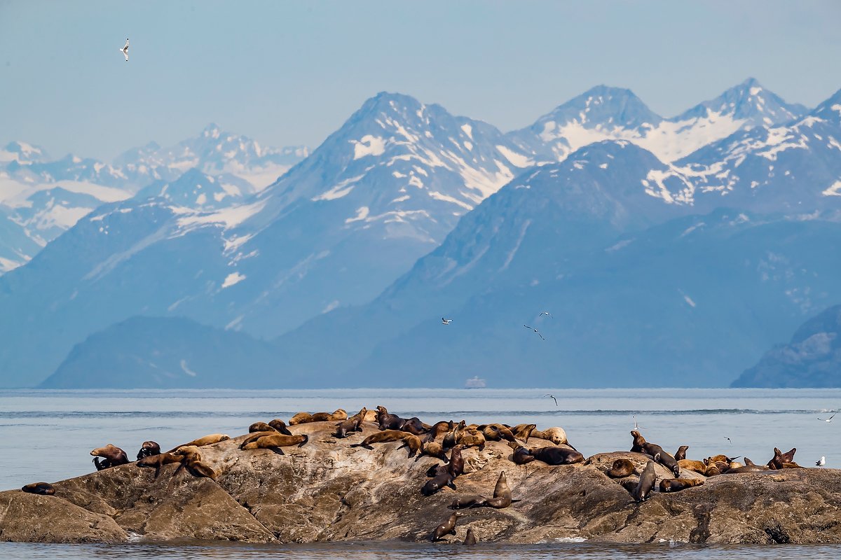 After lunch around the bend we dropped our expedition landing crafts and explored the Inian islands in perfect sunny calm conditions! The Fairweather Range in full glory we could see Mount La Perouse (10,728 feet), Mount Crillon (12,726 feet) and Mount Bertha (10,204 feet) ascending from sea level. This towering coastal range intercepts Pacific moisture resulting in vast icefields and glaciers such as the Brady that was visible as we rounded the corner. Steller sea lions swam around us in great number…some curious, others startled by our sudden presence... it was an incredible feast for our senses both visual and olfactory. Along the edge in the kelp a sea otter slept as if unknowing and unconcerned to our presence while sea lions frolicked in and out of the water. Truly one of the most incredible expedition landing crafts rides on the planet we felt so blessed to have a such extraordinary sightings and conditions!