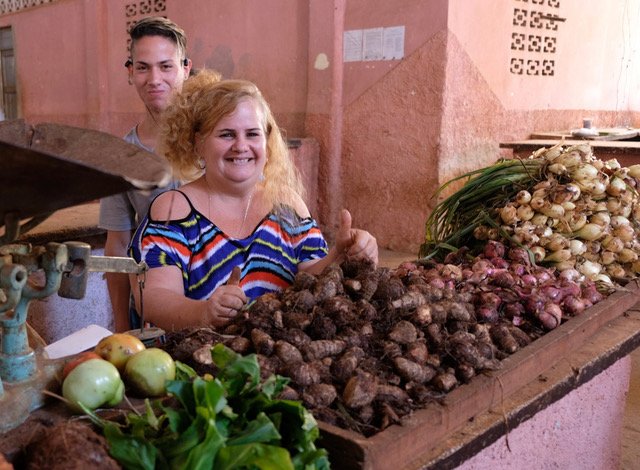 Our walking tour of Cienfuegos began at the statue of Cuban musical hero Benny More. We strolled down the main pedestrian street, and looked in at the pharmacy and the hardware store as locals did their errands. At the municipal market, vendors sold onions, greens tomatoes, root vegetables and grains, and butchers readied cuts of pork with enormous knives. The market was quite busy, but even so, vendors smiled as we walked through with our cameras and curiosity.