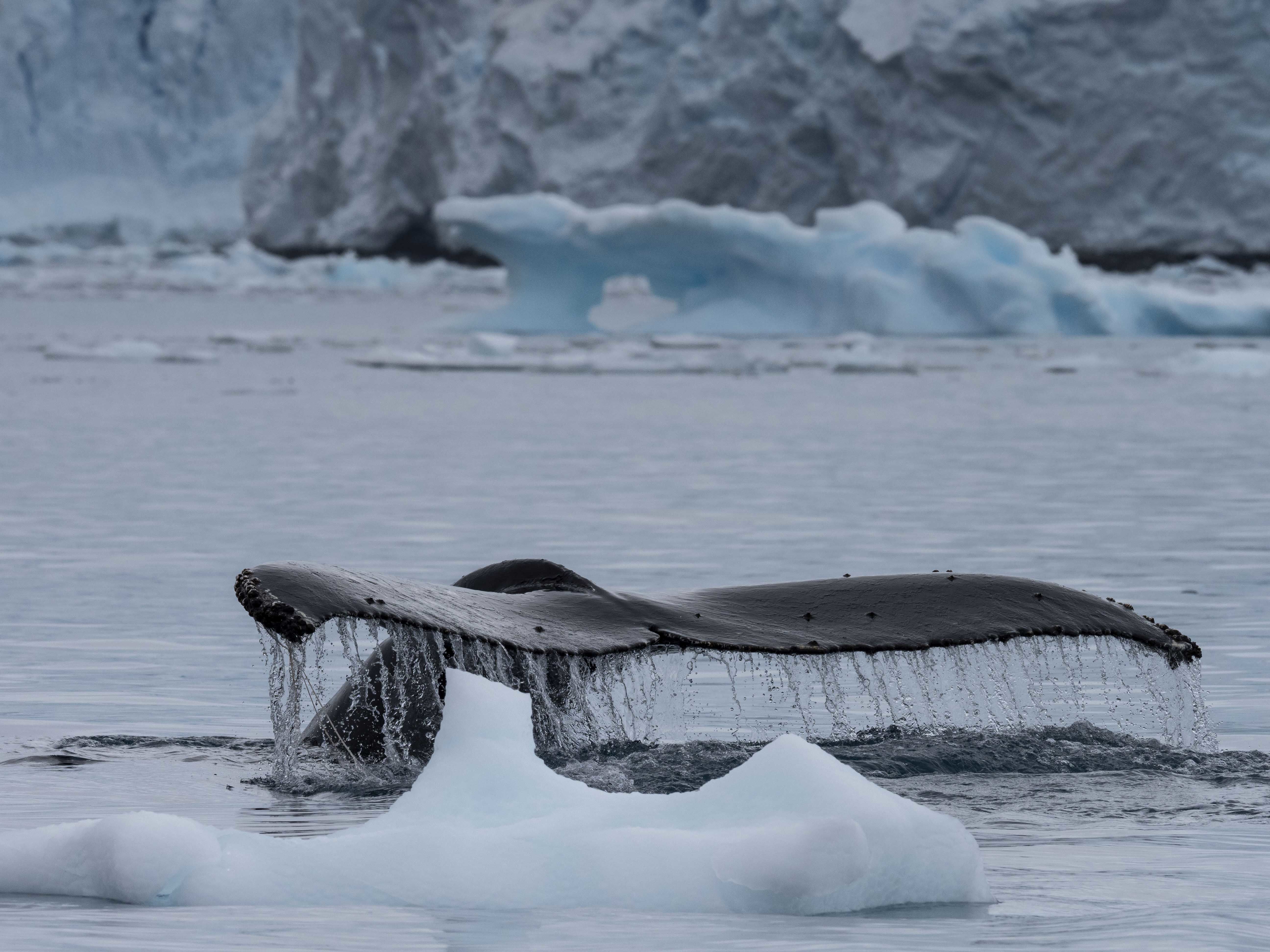National Geographic Resolution spent the day surrounded by icebergs and sea ice in Crystal Sound as the weather got sunnier throughout the day. Guests experienced Detaille Island during the morning activities. Everyone went on guided Zodiac rides around the island where we saw numerous crabeater seals and icebergs. We stopped to observe an Adelie penguin colony, including dozens of penguins waiting to jump in the ocean. Many people went on shore to see the historic research hut from 1956-58, including all the original canned food and equipment kept in pristine condition. Some guests climbed the snowy hill to see the top of the penguin colony across a deep ravine. In the afternoon, the ship cruised around Crystal Sound so we could see the sea ice, glacial icebergs, and huge tabular icebergs. There were beautiful blue sea caves and arches in many of the icebergs, as well as dozens of crabeater seals on the sea ice. However, two humpback whales stole the show when they appeared in the sea ice near the ship. We could hear their loud exhaling and see them diving up close. The rest of the day was spent relaxing, enjoying a presentation, cocktail hour, recap, and dinner as the sun showed brightly in the west. What a perfect day to end our awesome week in Antarctica.