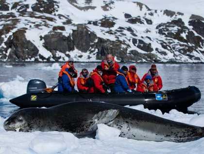 In calm seas and sunny weather the ship continued on its course along the west coast of Graham Land, Antarctica to Cierva Cove and the Argentine base Primavera. Cierva Cove was dominated by the massive tidewater glaciers that were pouring off the mountains into the ocean and icebergs that were the result of the calving of these glaciers. The massive ice forms towered above us, glowing green and blue in the sunlight. Basking on the pack ice in between these massive giants we found Weddell seals sunning themselves and our first close-up sighting of a basking leopard seal! This large reptilian pinniped was stretched out in the sun on a small floe, paying no mind to the surrounding Zodiacs. The prowess of this predator was plainly evident by the sinewy build and incredibly large jaws. It was a very humbling moment to be in the presence of one of Antarctica’s top predators.