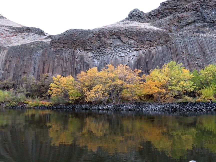 The weather was cloudy, cool and breezy at dawn—but not raining as predicted. On this first morning of our expedition we boarded jet boats piloted by Cap’n Chuck and Cap’n Eric and away we went upstream on the Snake River, bound for wild and scenic Hells Canyon, the deepest river canyon in America. Our first stop was to view an amazing outcrop of columnar basalt with perfect hexagonal columns, some curved in curious ways that defy explanation. Trees at the base of the basalt cliff blazed gold in their autumn colors. Mallards and coots foraged in the shallow water at the river’s edge, and all along the river great blue herons stood motionless, sentinel-like, waiting to make a meal of some hapless fish passing by. Double-crested cormorants and bufflehead ducks flew past. A bald eagle perched in a ponderosa pine tree. Layered basaltic lava flows stepped up the canyon walls. Looming above the river the rock was weathered to a rich, dark brown and trimmed out with the buff-colored grasses of autumn. Crimson sumac and yellow mulberry trees added splashes of color to the landscape.