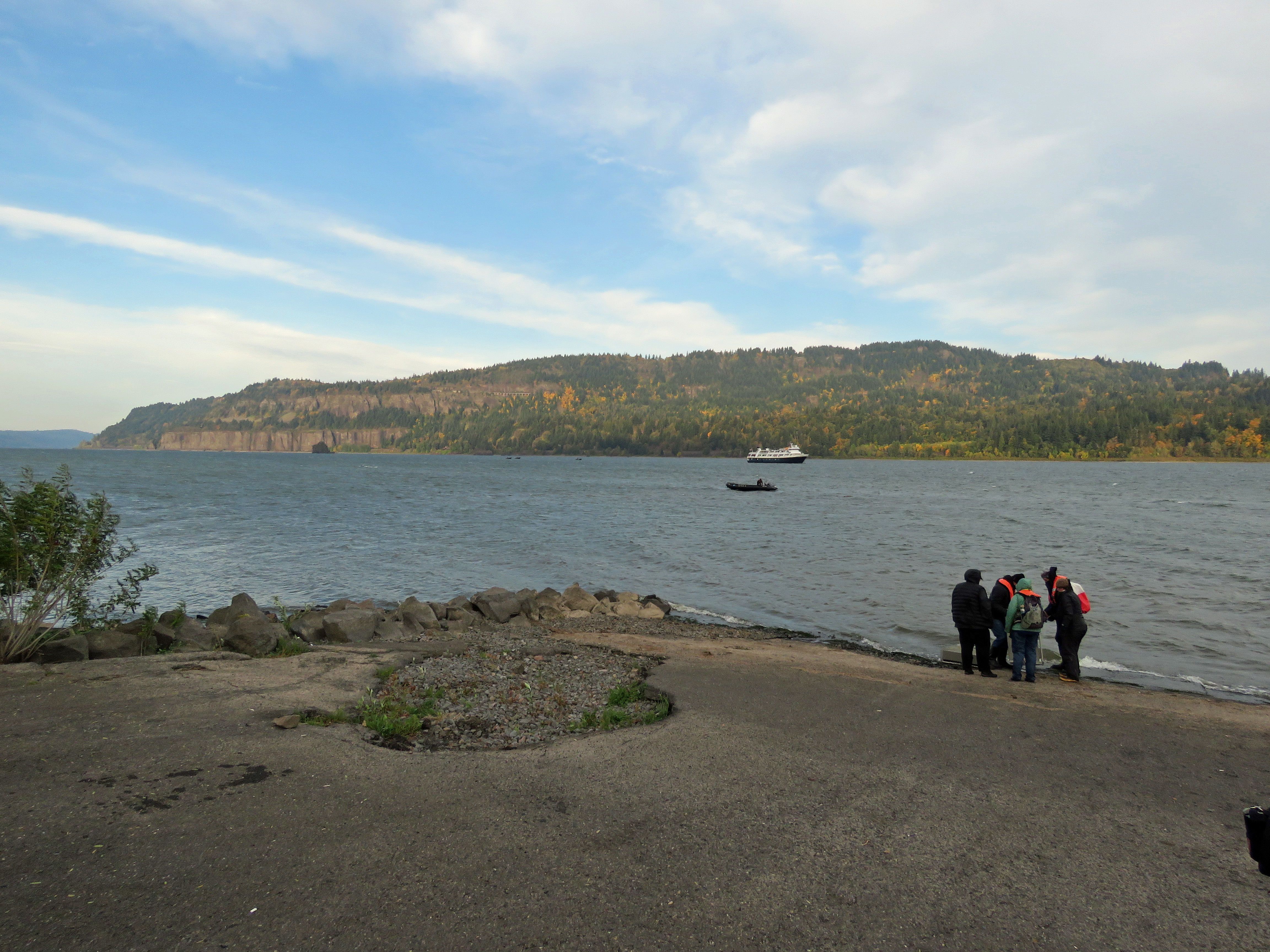 At sunset last night, we began our journey eastward from the mouth of the Columbia River, passing by Portland in the predawn and reaching the Columbia River Gorge just after breakfast. Fierce winds of 35-40 mph blew from the east as we prepared to Zodiac ashore for hikes up Taylor Creek canyon, a visit to the Bonneville Dam Fish Hatchery, and world famous Multnomah Falls. After lunch, we passed through the locks at Bonneville Dam and then skirted the remains of a mega-landslide, known as the Bridge of the Gods, which once blocked the Columbia River. We anchored for the evening at the town of Hood River, Oregon.