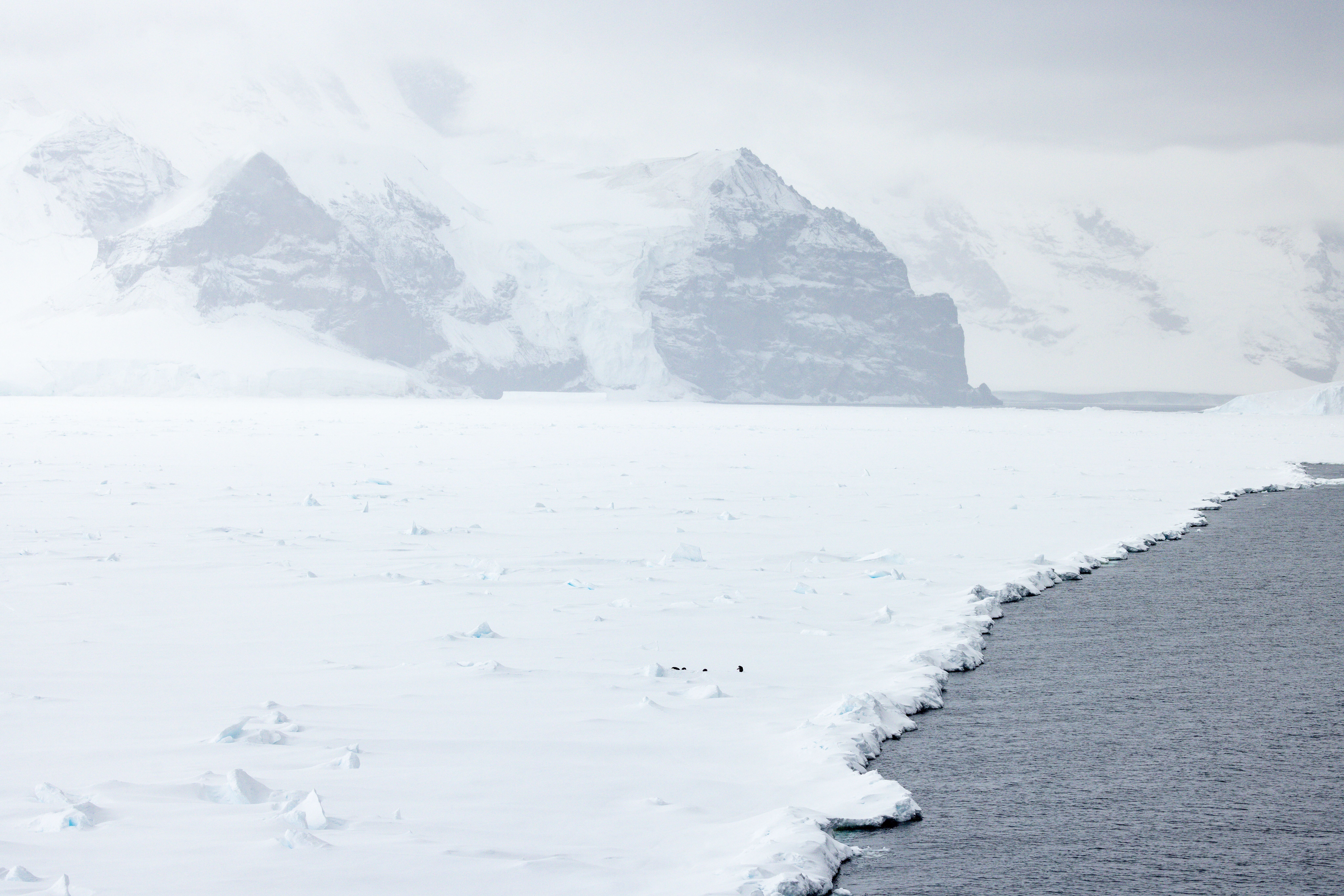 It snowed pretty much all night, so we awoke to the decks covered in snow and a view of the fast ice where we parked the National Geographic Endurance overnight. This morning we got a chance to explore the fast ice. Everyone had lots of fun taking photos of themselves “pulling” the ship using the bow line. We had a nice large area to explore and plenty of snow angels were created and photos of the reflections made in sunglasses and goggles. Some decided to get their daily steps in doing loops of the area we had created. During the morning we also had visits from some curious Adelie penguins and a number of South Polar skuas flying by. It was snowing most of the morning adding to the ambiance of the whole experience.