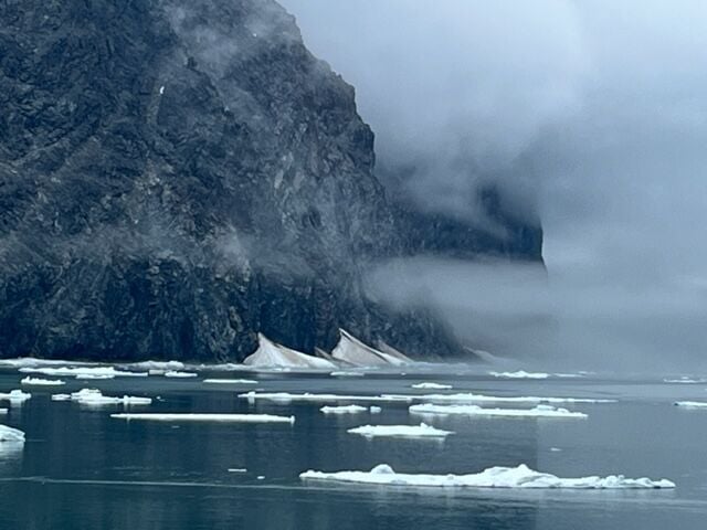 We are in a water world: freshwater rain, saltwater ocean, ice in the form of icebergs, sea ice, multiyear ice, and water particles in the fog and clouds that hide the horizon. As Captain Martin tells us, “You really learn how to drive a ship in ice because that’s where it’s really tricky.” The Bridge Team does an exceptional job.