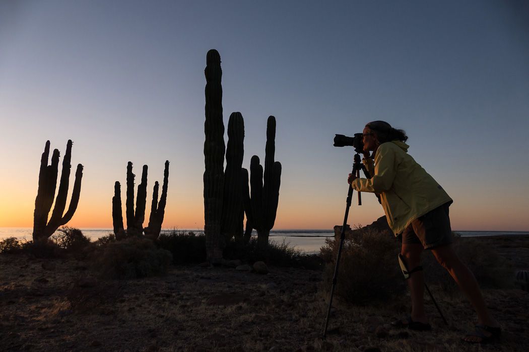 What a start to our Baja voyage! We woke up to a beautiful sunrise as we cruised north through the area of Bahia de Loreto National Park. Shortly after breakfast, though, our kayak and snorkel briefings were interrupted by a chaotic feeding frenzy. Initiated by a large school of fish, long beaked common dolphins porpoised through the water as they chased after their prey; pelicans dove straight into the waves and surfaced seconds later with their catch; gulls dipped their beaks in the water and came up with a mouthful of fish; and frigate birds soared high above taking every chance they could get to steal food from their fellow hunters. It was madness in the best possible way.