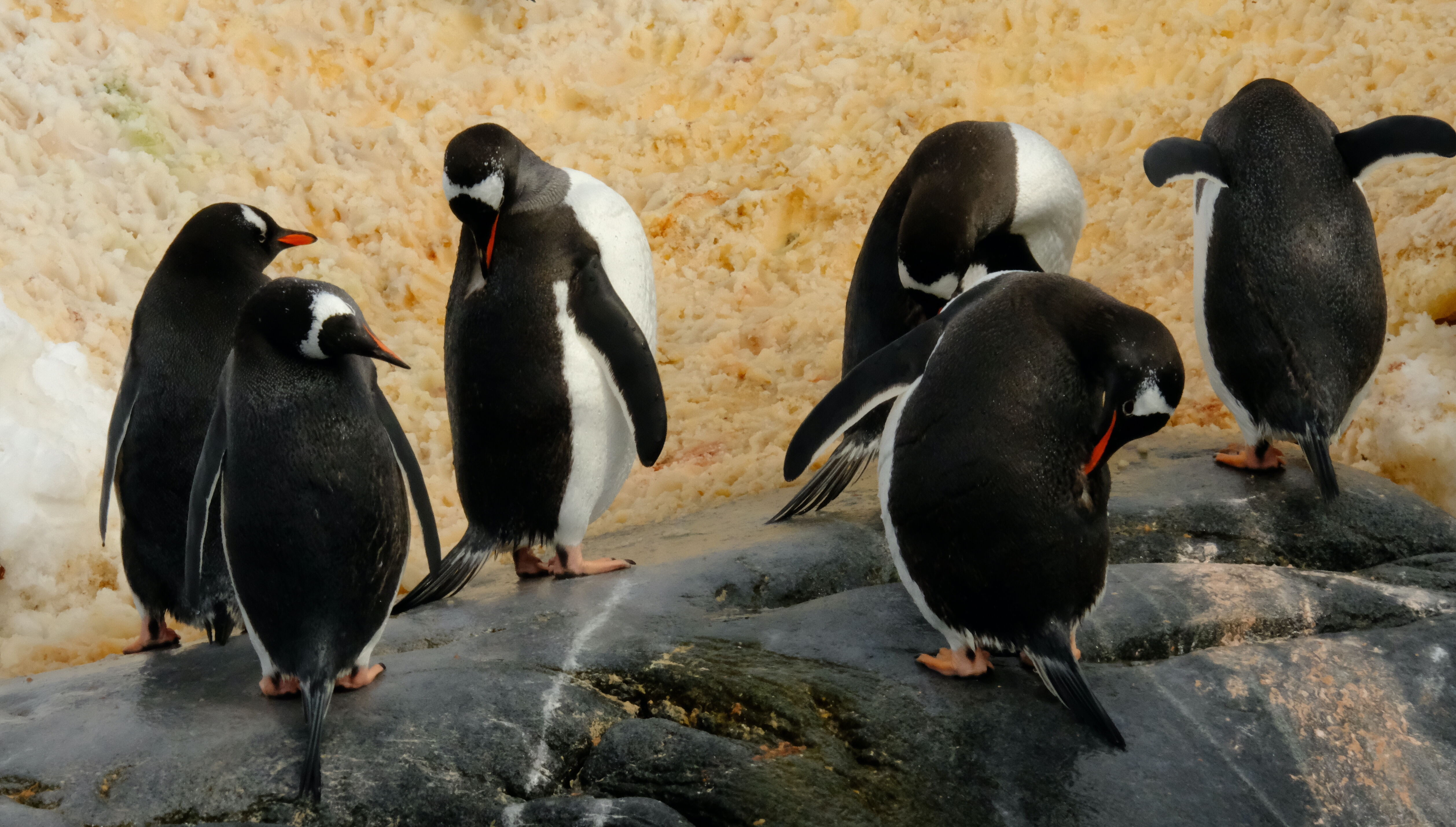 The ship continued its exploration of the Antarctic Peninsula. In the morning, we were in position at Cuverville Island for our first steps on the continent of Antarctica. And what scenery we found! Icebergs in all shapes and shades of blue, majestic mountains, and, of course, penguins. Lots and lots of gentoo penguins. As soon as we stepped on the beach, we were greeted by the first penguins. Plenty of curious penguins were swimming in the water, and they came closer to check us out. We got the chance to visit penguin colonies on the shore, and we observed penguins patrolling back and forth on their highways. Some of us even caught some naughty behavior. Penguins are full of surprises.