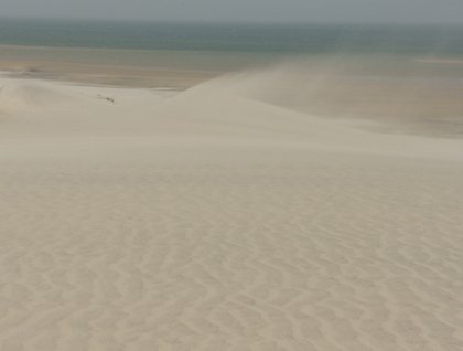We arrive at the camp. The group is quite excited to be here and they spread around to discover the place...while the wind starts blowing slowly. I go straight to the lonely dune visible. It’s a mile away. When finally there, I am already walking diagonally, leaning into the strong wind. Sand flies everywhere. I protect my camera bag with the wind-stopper jacket I have. Better to protect it than me. I wait for few minutes on the top of the dunes, hearing the whistle of the wind and the pricks of the sand on my skin. Then, I turn and I go back, following my footprints already erased.