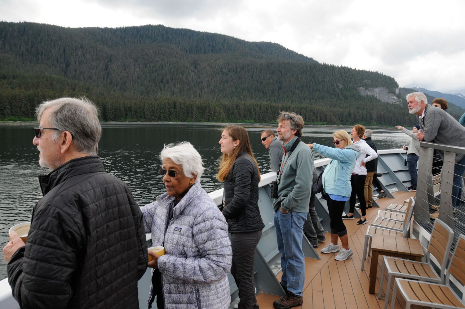 After a steamy frothy espresso and some toe-touching with our wellness specialist, our blood was flowing properly, and we were ready for another day in the Great Land. Diners were joined for breakfast today by a humpback whale cow and calf engaged in restful “logging” activity, setting the stage for a serene morning sail. They turned out to be the first of many majestic M. Novaeangliae we would encounter, most being much more active. We soon found ourselves approaching Morris Reef, and surrounded by not one, but two groups of humpbacks engaged in cooperative bubble-net feeding behavior! We spent time with both pods, viewing and photographing many spectacular lunges, with up to nine of these leviathans’ gaping maws breaking the surface simultaneously and in tightly choreographed formation. Our Global Explorers were then given an opportunity to receive Zodiac driving lessons from our USCG-licensed captains. All souls returned. We continued into the storied seven-mile-long Sitkoh Bay. Here we hiked an old logging road; amongst towering Sitka spruce, frequent bear signs, black-tail deer, and banana slugs galore! Once the wind abated, we also had the opportunity to launch our kayaks and enjoy a leisurely paddle in the bay, with views of National Geographic Venture , bald eagles, and an early 1900s cannery sight. At the end of the day, the ship embraced our return with cocktails, charcuterie, and conversation. A typically highly succulent dinner was followed by a night-capping presentation on birds of the region from our resident ornithologist.