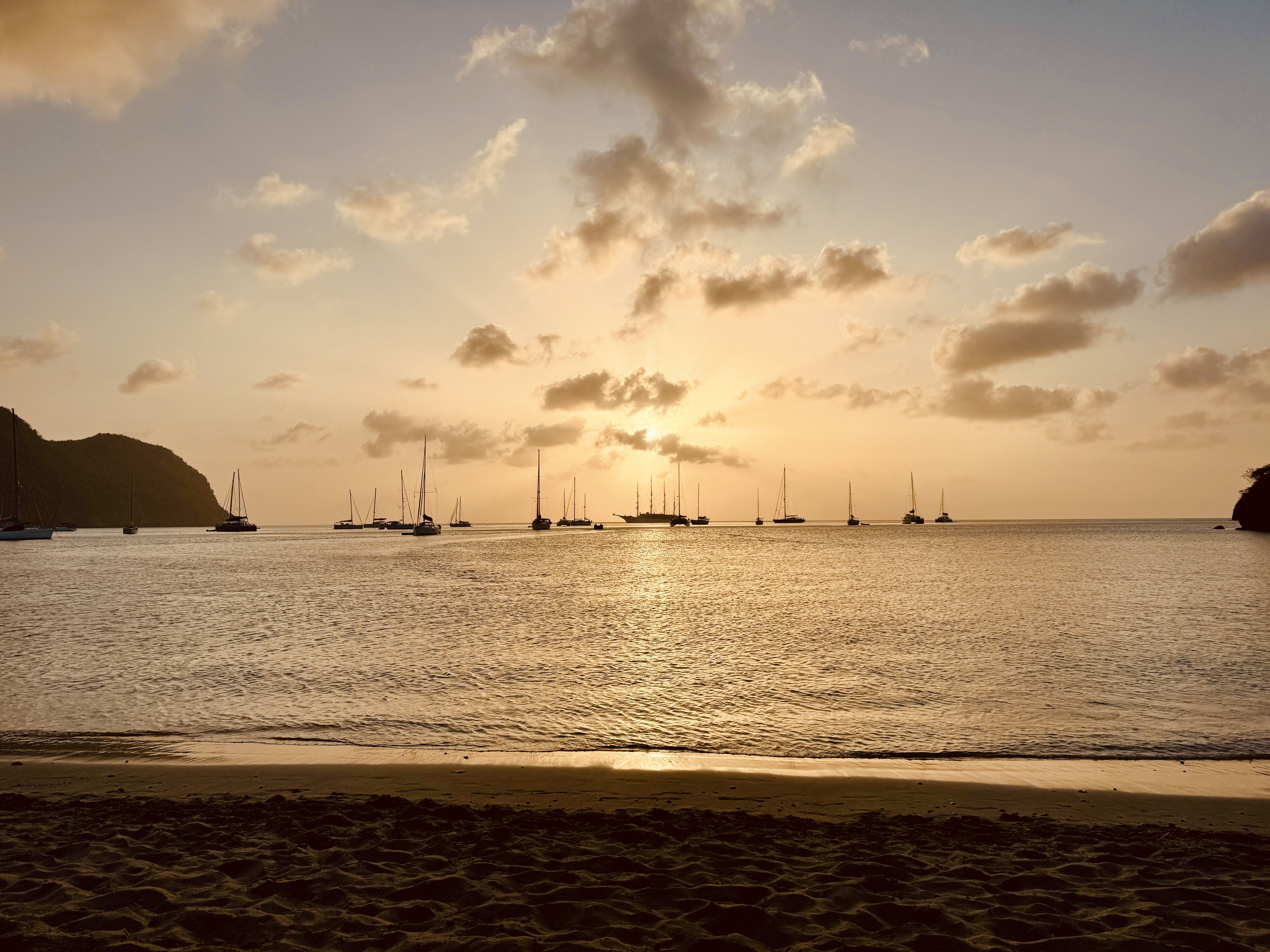 Bequia is one of the largest islands in the Grenadines and part of the country, Saint Vincent and the Grenadines. On our way to the island this morning, the captain announced ideal conditions for the willing and able guests to climb out on the bow sprit while underway. We pulled into the blue waters of Admiralty Bay off Port Elizabeth for our island tour in small pickup trucks. In the late afternoon, we all met at Prince Margaret Beach for a snorkel and swim and enjoyed one of Jack’s Beach Bar signature drinks called “Island in the Clouds” as the sun set over this idyllic landscape.
