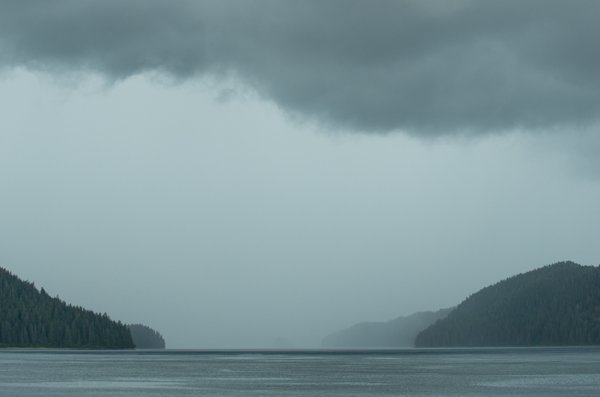 Following lunch, our photo instructor Ian gave an educational and entertaining presentation introducing digital photography, followed by hands-on breakout sessions. Later in the afternoon, as we headed through Peril Strait, we spotted a mother brown bear with two young cubs! The mother grazed nonchalantly on the beach, chowing mouthfuls of grass and eyeballing the ship periodically. There was a lot of excitement for our first megafauna of the trip! As we continued on our way, thunder and lightning crackled and dark clouds boiled ahead. Finally wind smacked those of us on the bow, followed momentarily by pelting sheets of rain. Within seconds, the bow was cleared of all hominids. Before cocktail hour a humpback made a solo appearance, impressing those brave enough to don rain gear and watch it bubblenet feeding right in front of us!