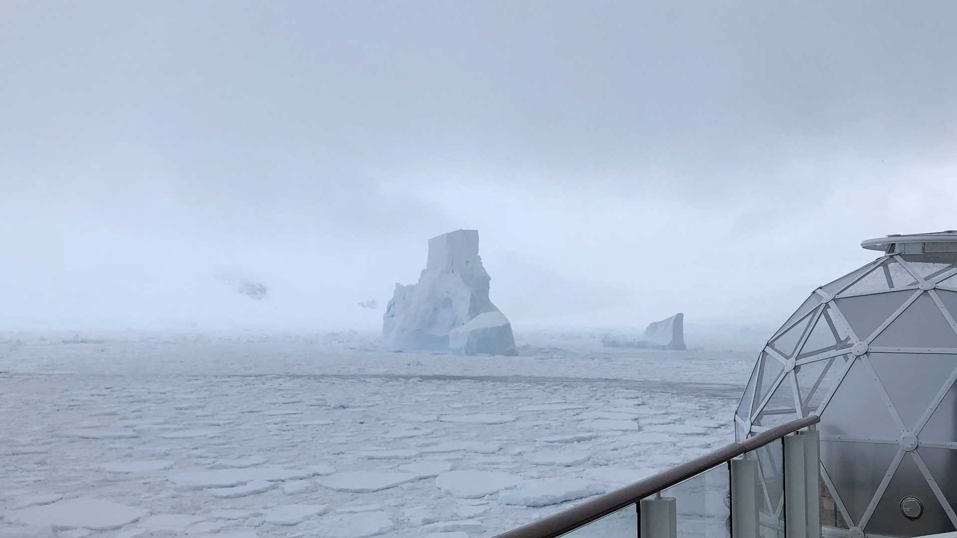 Our departure from Detaille took us through close, wind-driven pack ice, highlighted by brief glimpses of the surrounding mountains through shifting fog.