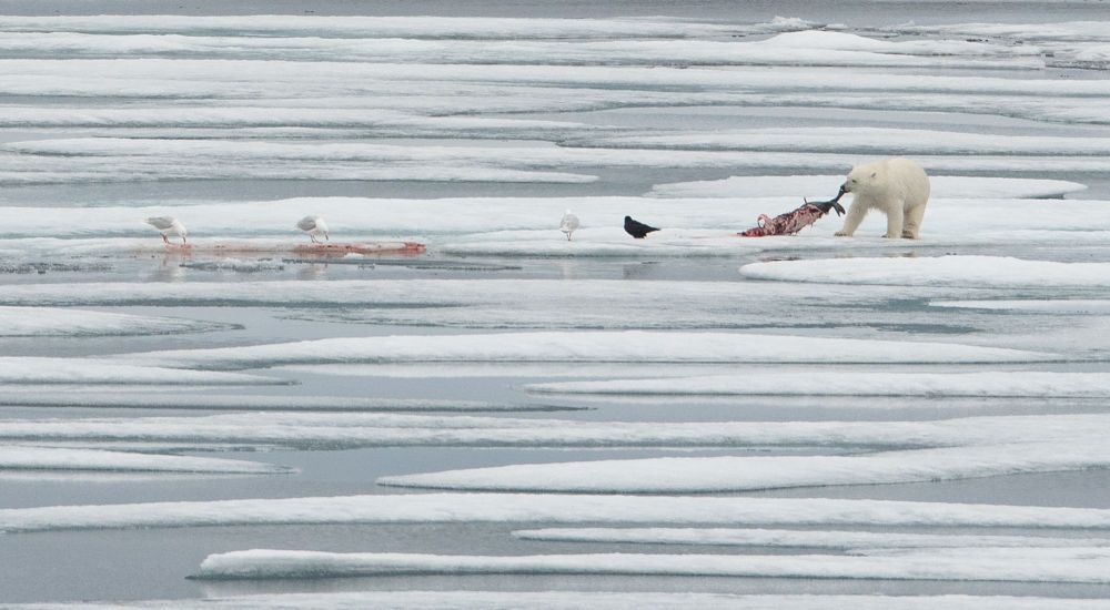 After a few moments, the bear dragged its kill out of the snow, swam into the water with it, and then pulled it back onto the ice. Ravens and gulls came in to grab pieces while the bear wasn’t looking. The captain drove the ship closer until we could clearly see the bear shaking water from its fur and tugging at the seal’s flippers.