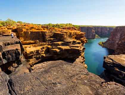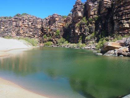 This morning we awoke to a spectacular Kimberley sunrise where Mother Nature created a few new colors. She also produced a quite breezy day, just enough to keep the temperature down. Our intrepid adventurers boarded the Zodiacs at 7:00 a.m. and made our way across a choppy Koolama Bay to the mouth of the King George River. As our flotilla of Zodiacs snaked its way along the river, we saw the stunning beauty of the gorge and the natural colours of the sandstone, exposed by the erosion taking place relentlessly. As we journeyed upriver, we observed osprey nests, eastern reef egrets, pied oyster catchers and of course salt water crocodiles. The sandstone canyon was spectacular and we took a plethora of pictures that we knew would not do the scenery justice. Close to the edge of the river and the falls, we saw great examples of ‘honeycomb erosion’ where water whipped up by the wind has dried within the sandstone structure, dislodging particles one at a time. A number of us had chosen the five-hour tour that included a hike to the top of the falls. After a brief chance to take photos of the waterfalls, we motored toward the north-eastern bank to commence the climb up the side of the gorge. With our expedition leader Darrin leading the way, we trekked up the steep track to the plateau from where we made our way to the top of King George Falls. The view was stunning and the clicking of camera shutters could be heard constantly. We saw the Zodiacs cruising along the sandstone walls, our fellow guests peering upwards in awe and the Zodiacs leaving a white trail of foam as they journeyed to their destination at the end of the gorge. A few of us could not resist the call of the inviting water and slipped in for a refreshing swim. Although it was quite shallow as this is nearing the end of the dry season, it was refreshing, it was then time to slowly make our way back down 100 meters below to our waiting Zodiacs. To our surprise, the ships galley had organized a treat for us once we had returned from the falls. Tucked in behind a rocky cliff hid a refreshment Zodiac, with champagne, orange juice and gourmet croissants being served. For those of us who didn’t do the walk up the falls there was a opportunity to do a mystery tour, to a secret lagoon across the other side of Koolama bay, and what a treat it was to turn a corner of a massive cliff to see a beautiful lagoon trapped by the falling tide, the surprises just keep on coming. The final Zodiacs arrived back to the National Geographic Orion just as the sun was slipping below the horizon and we were all treated to yet another display of colours that were unknown to us before our expedition in the Kimberley began.