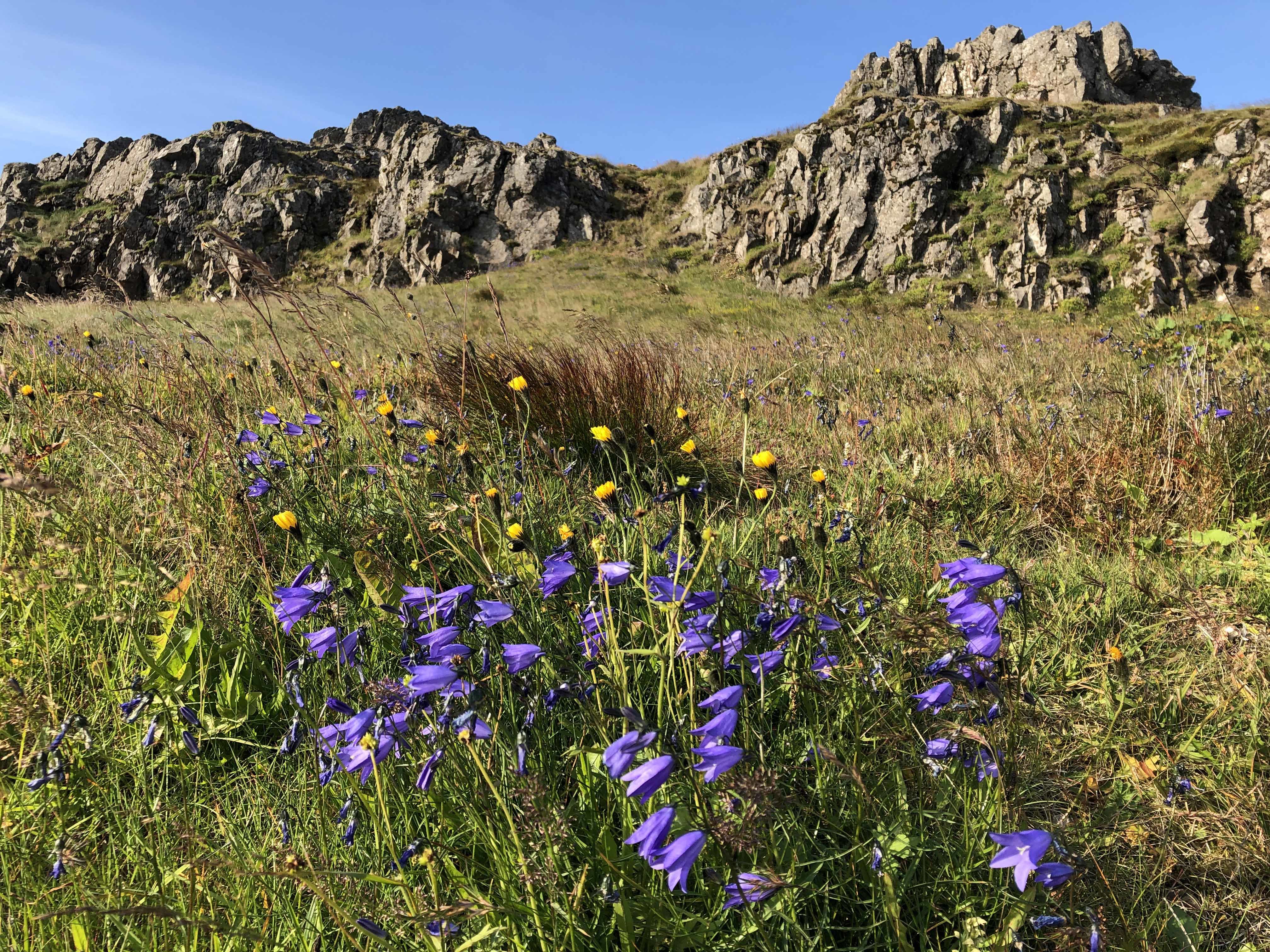 Those of us on the coastal walk were treated to amazing views of Djupivogur and the island of Papey from a lookout point. Then we walked down to the gorgeous black-sand beaches that the south coast of Iceland is famous for. Flowers were still in bloom—Alaskan lupine, bluebells, thrift, arctic thyme, and Iceland’s national flower, mountain avens. After a walk among the dunes, we made our way past a freshwater marsh to a sweet spot, protected from the wind, where we were snacked on crowberry juice and traditional Icelandic donuts called kleinur.
