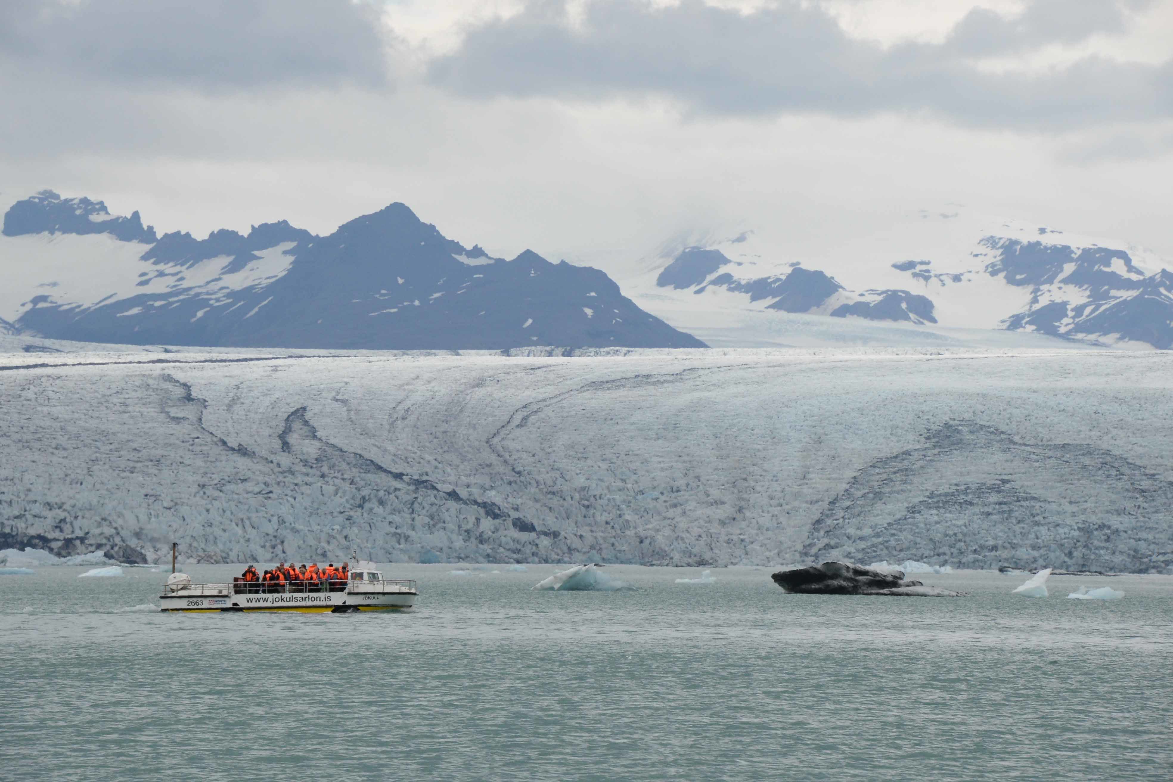 Meanwhile, others in our group visited Jökulsárlón Lagoon, where we boarded amphibious vehicles that drove into the water and function as boats so that we could get close to floating glacial ice. In the distance across the lagoon, we could see the source of the ice: it had calved off Breiðamerkurjökull Glacier, one of the 20 valley glaciers that spill down from the Vatnajökull Ice Cap. It was amazing to hear that the ice had only recently retreated from the lagoon. In fact, the lagoon didn’t exist only 80 years ago, but is now 5 miles long and nearly 1000 feet deep.