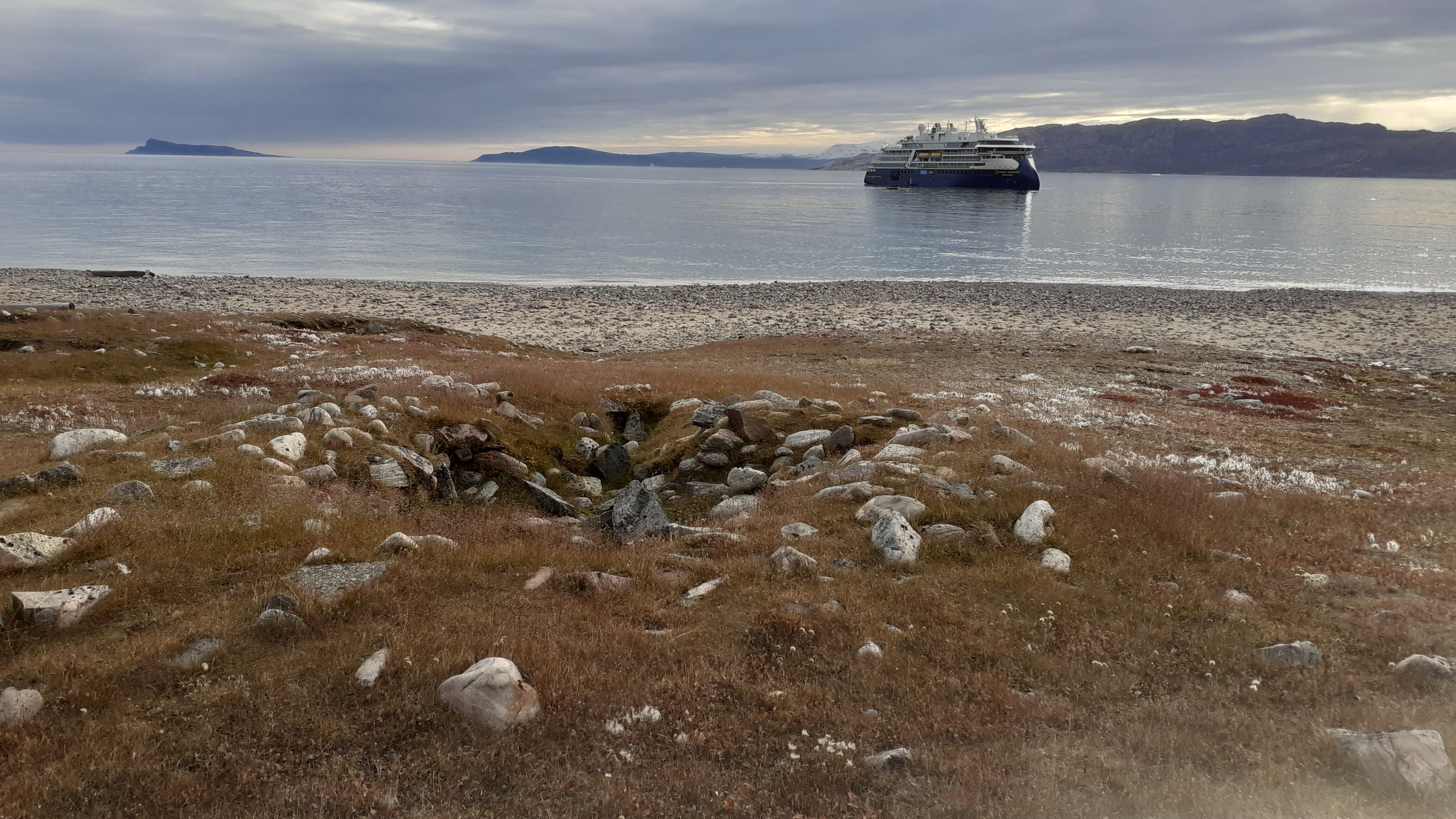 We disembarked at around 1400 and were greeted with evidence of the Thule culture, including remnants of old munitions cartridges and kitchen utensils from the Second World War. Around thirty guests took a medium hike tour of Dodemandsbugten with Eva and Eduardo. We saw multiple peat houses. Eva and Eduardo talked about the general plant life and geography of the area, while I talked about the Thule culture’s peat houses and customs. We continued uphill, where we spotted artic hares and some summer tent rings, probably from the Thule culture.