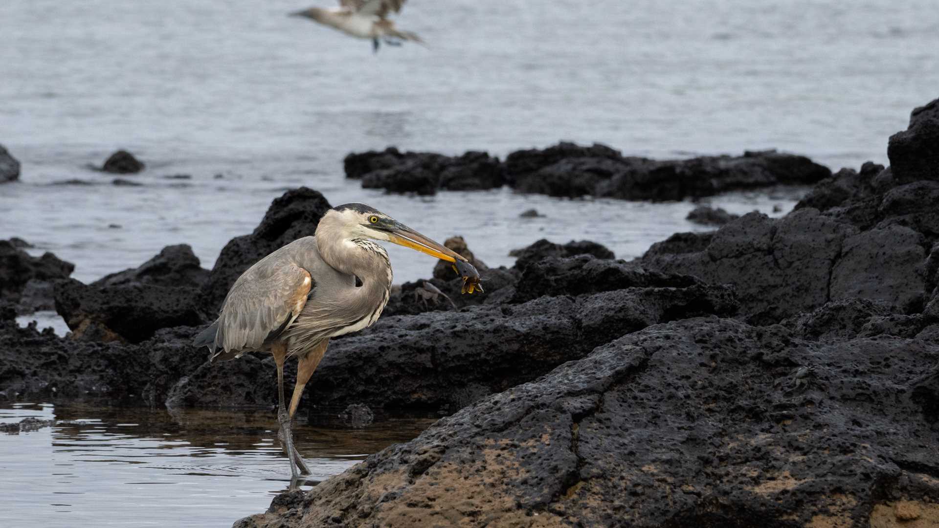 Today we visited Santa Cruz Island, located in the central part of the archipelago, surrounded by warm water. In the morning we started with a visit to Dragon Hill. This is an area where we can find land iguanas nesting. We began by visiting the shoreline where we found many birds feeding on the coast. A great blue heron was feeding in the tidal pools, displaying its skills when catching damselfish.